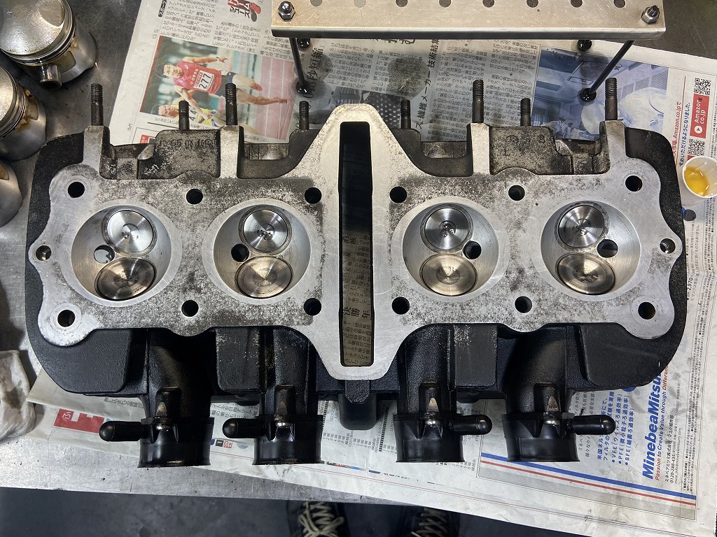 ヘッドは燃焼室とポートのカーボンを落とし、デッキ面をオイルストーンで修正して仕上げます。