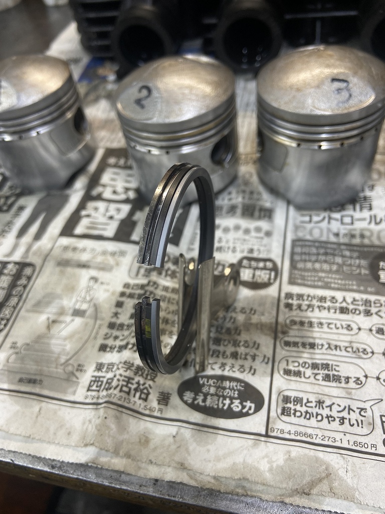 新品の純正ピストンリングをセットします。それにしても、40年も使用したピストンがこのようにまだ現役でいられるのが素晴らしいですね。