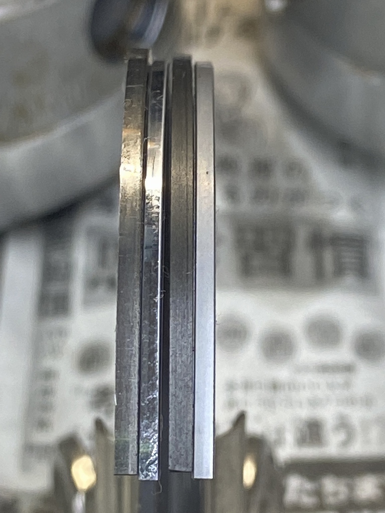 左から、旧2ND 旧TOP 新2ND 新TOP の各リングです。旧リングは摩耗が進み全面がシリンダー壁に当たる「ベタ当たり」状態です。通常は新品から数万キロ走行でこうなります。2NDリングは下側が大径のテーパーフェース、TOPリングは中央が高いバレルフェースです。詳しくはググってみてください。