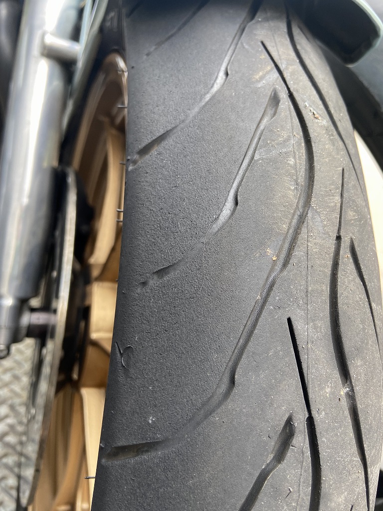 バイクの用途はほとんどが峠走りなので、フロントはこのようにサイドだけ減ってしまいます。センターには新品時のラインがまだ残っていますね。