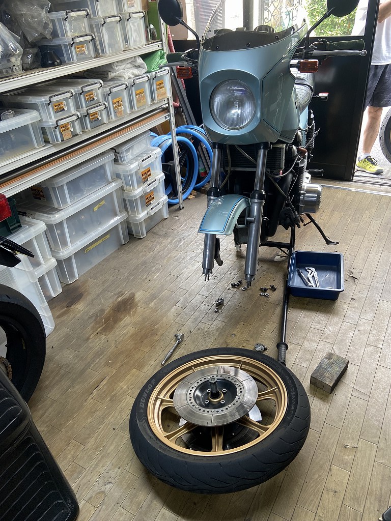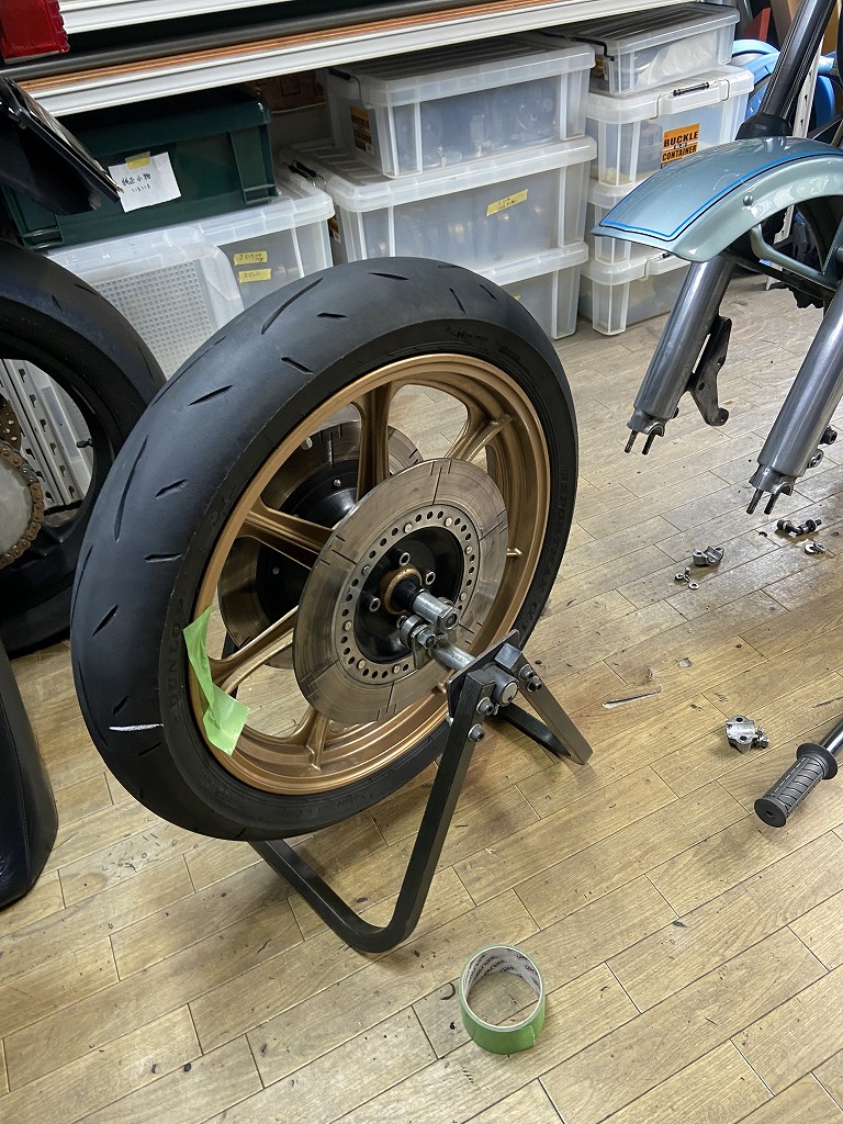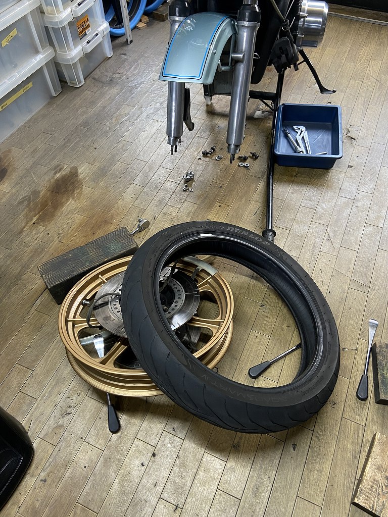 交換用のタイヤはお持ち込みの中古タイヤです。リヤは既にα14なので、これで前後揃いますね。