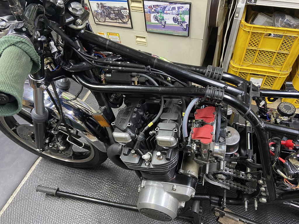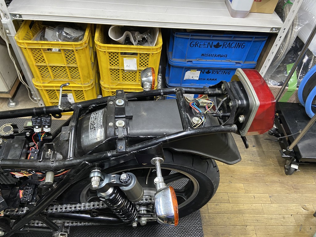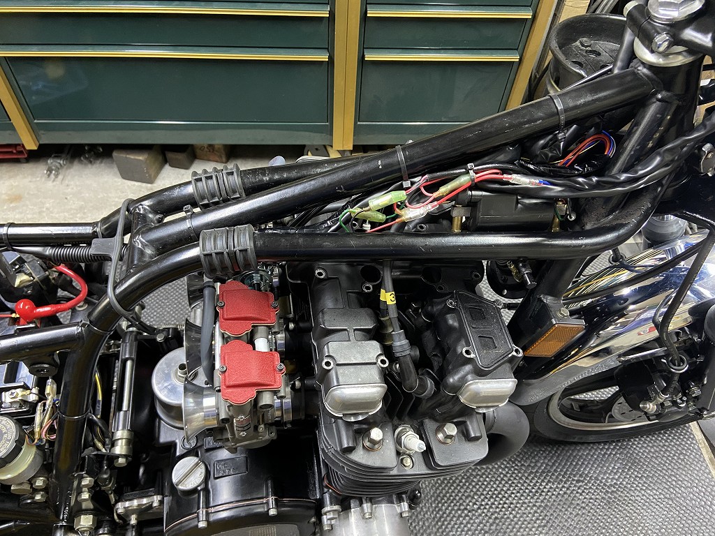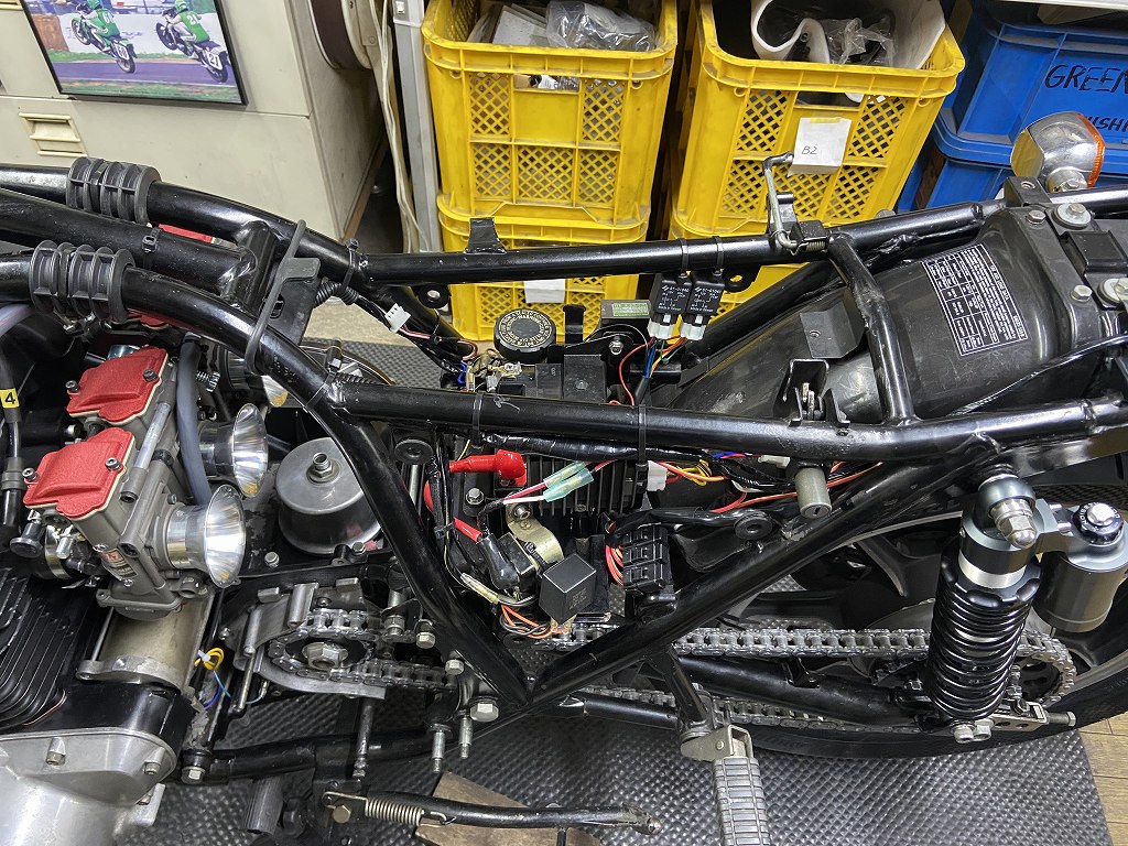 ハーネスの改造が済んだので動作チェックします。エンジンは、カムチェーンのトップアイドラーがまだ入荷していないので始動チェックは後回しです。