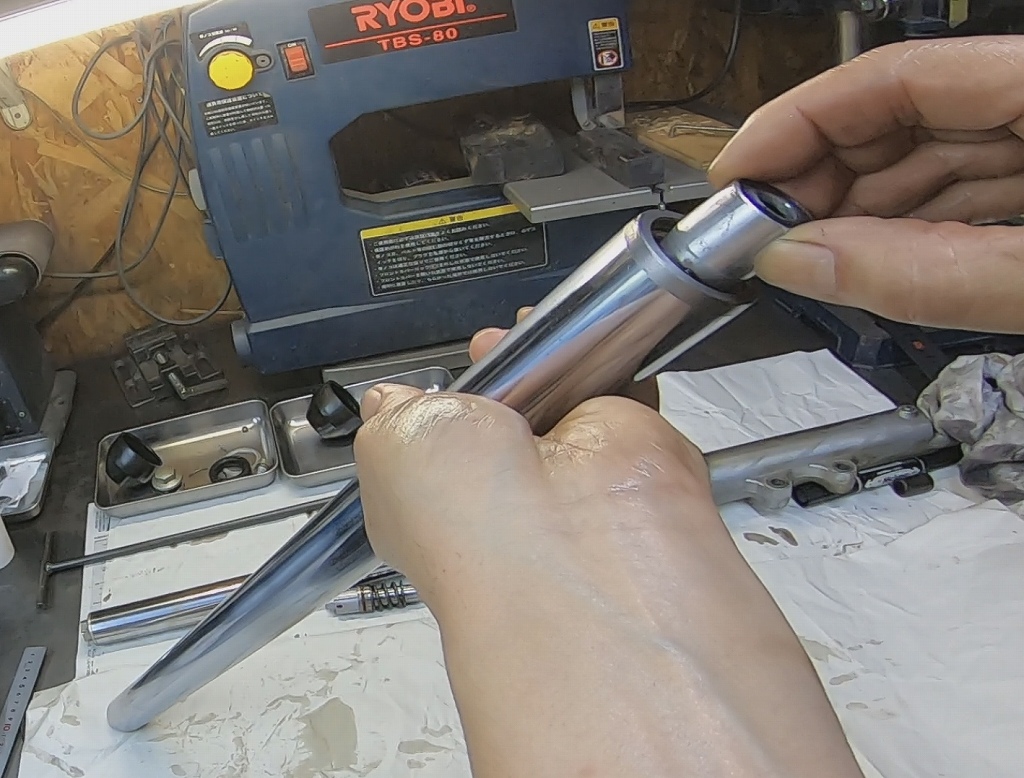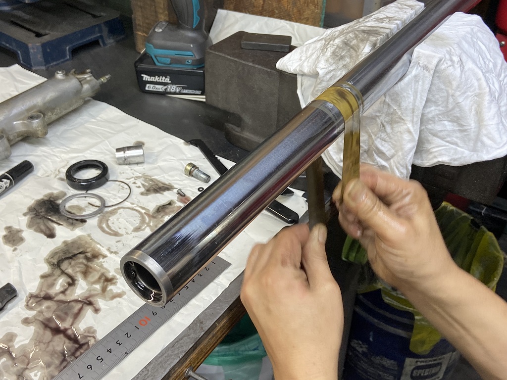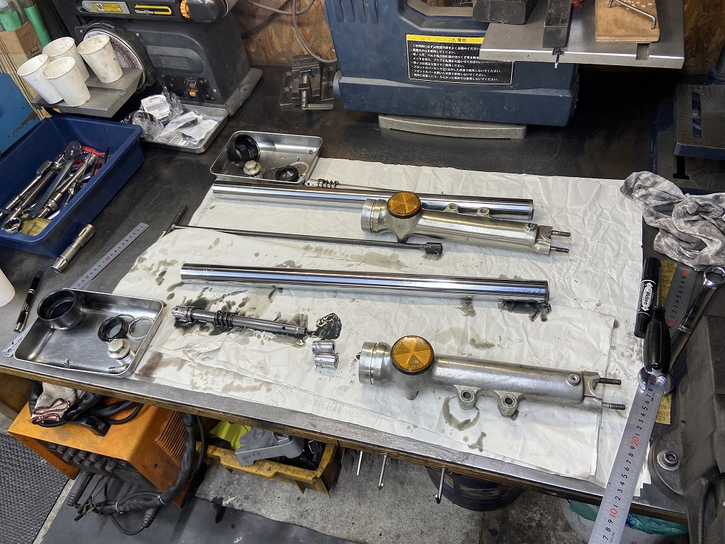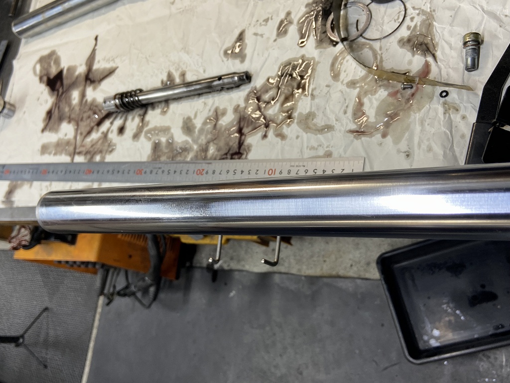 左側のフォークも分解点検します。左右でオイルの色が違ったので、粘度も違う状態だったかもしれません。