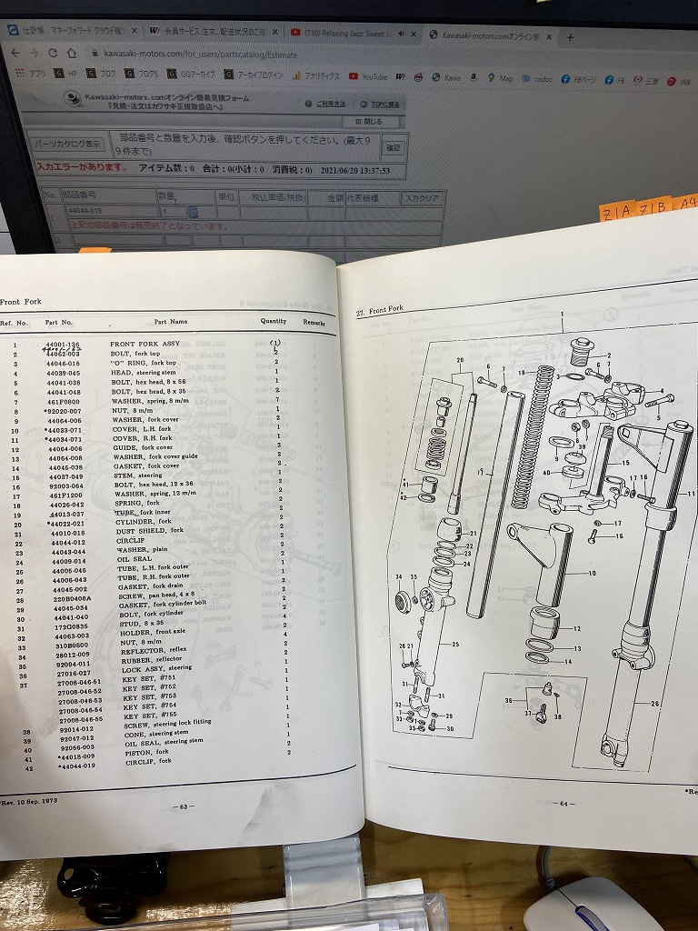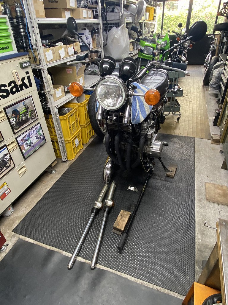 今回はフロントフォークのオイル漏れ修理と、ステムベアリング点検のご依頼です。