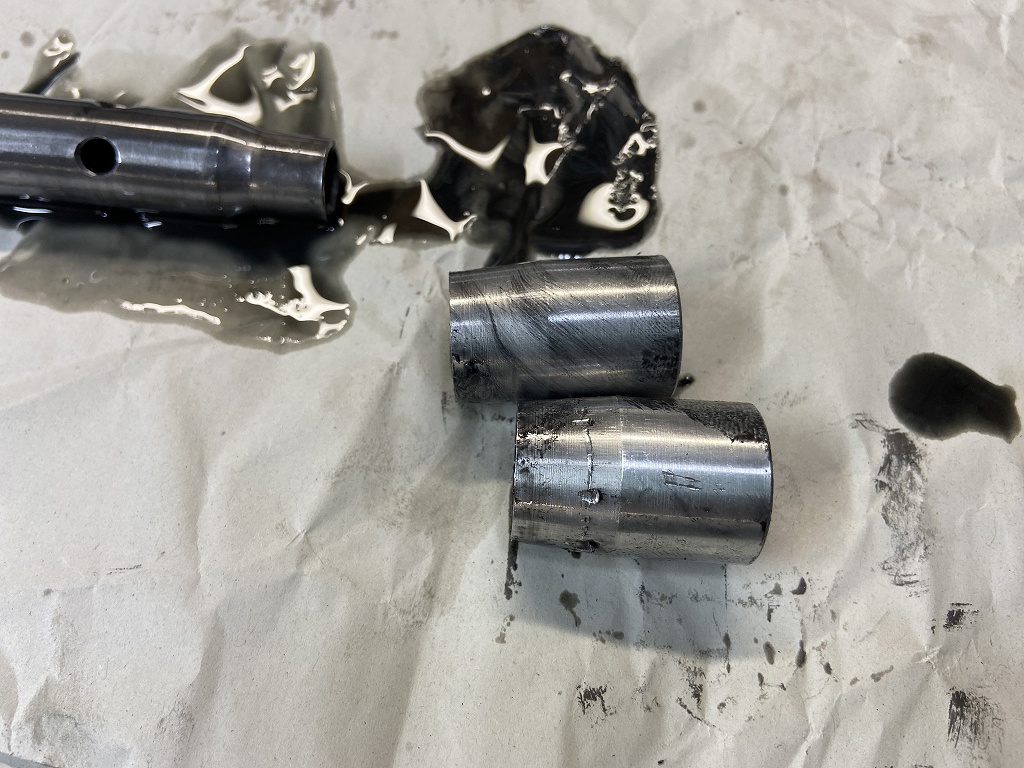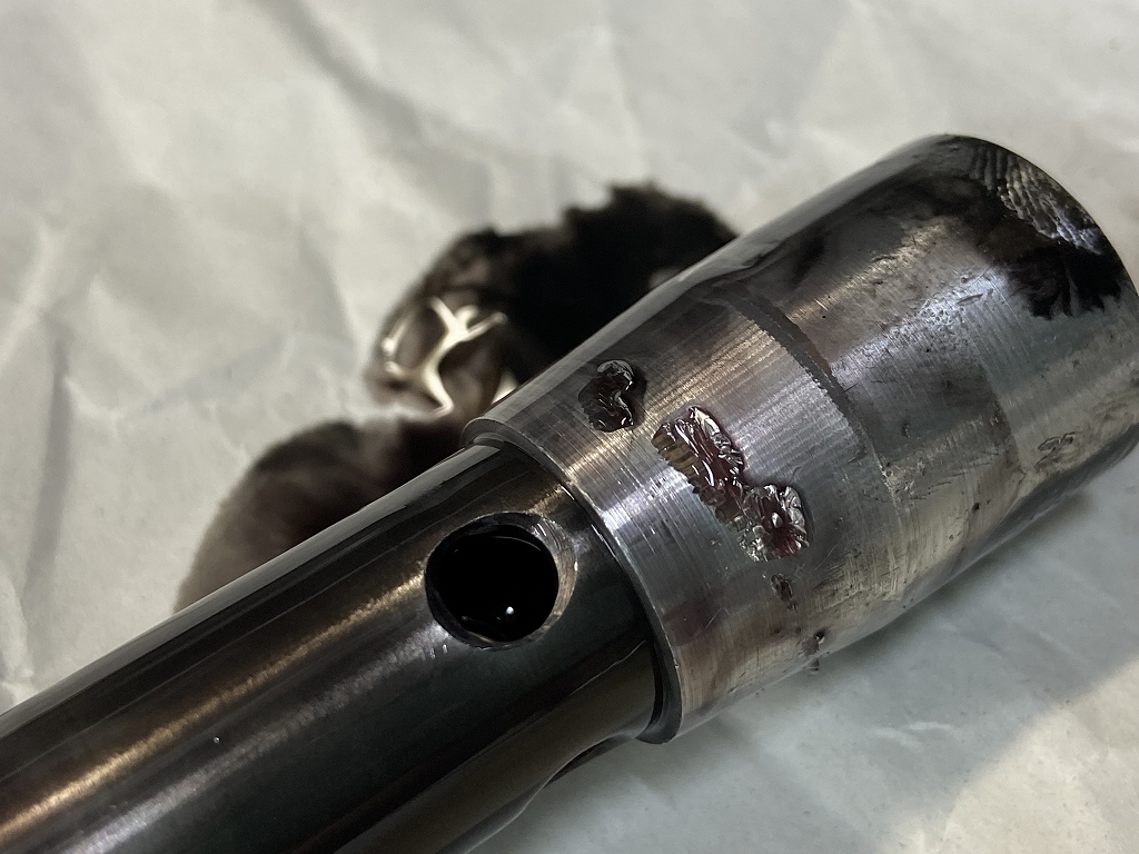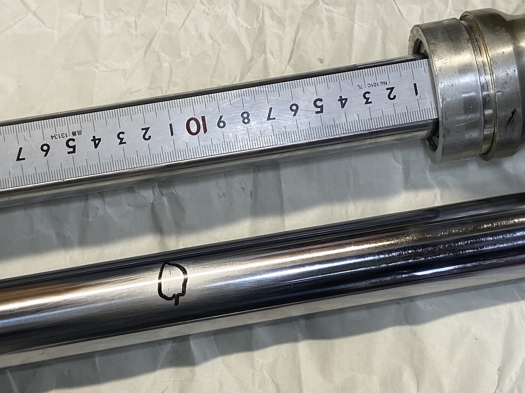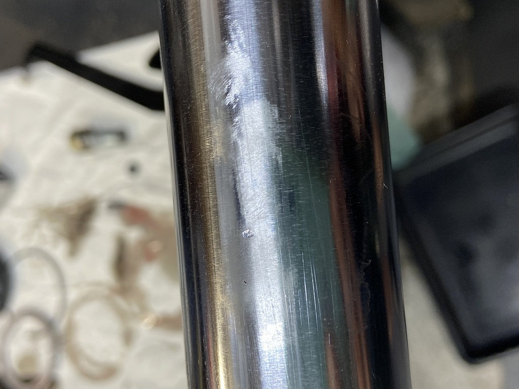 ピストンロッドの最下部にあるオイルロックピースですが、大きな深い傷が多数見られます。フルボトム時に何かと干渉しているのでしょうか。
