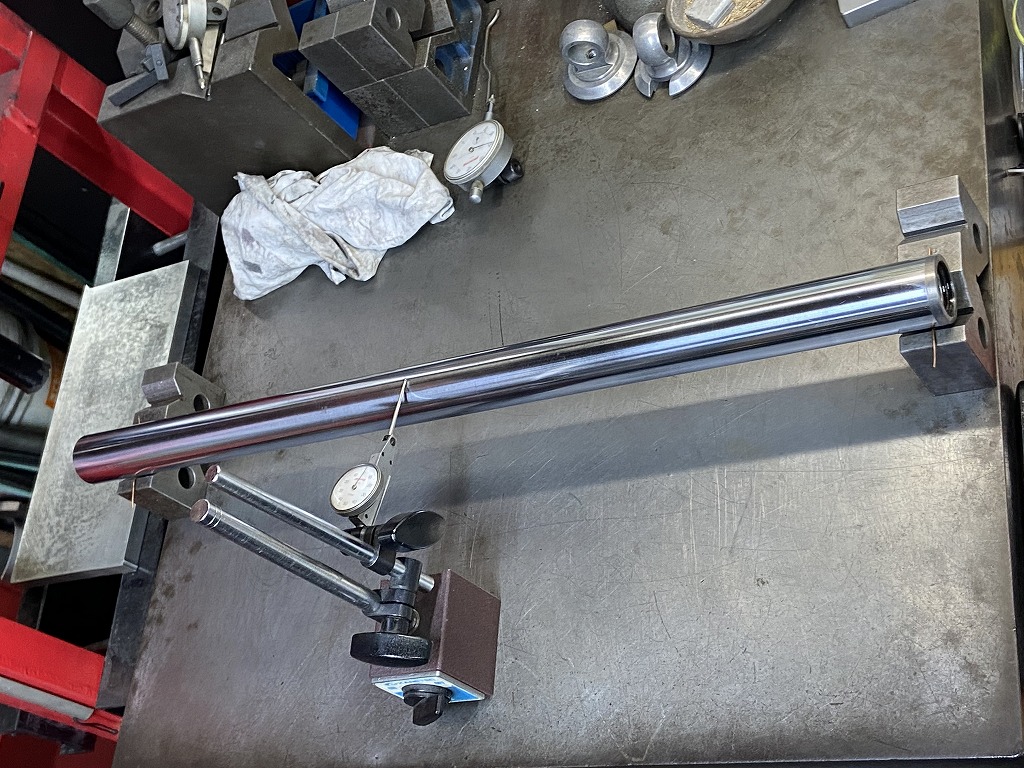 インナーチューブの曲がりを計測します。振れで0.06ミリあるので曲がりは0.03ミリあります。特に問題になるレベルではないでしょう。