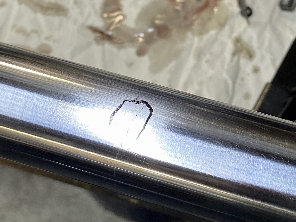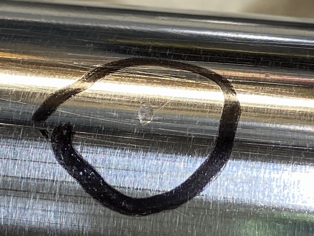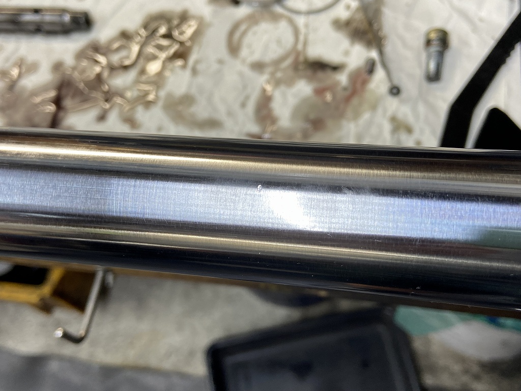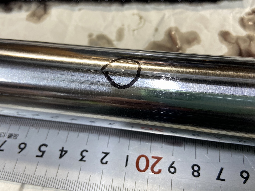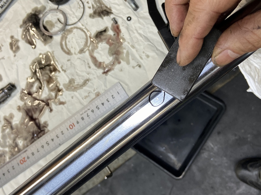 漏れの原因となる傷を探すと、ストローク120ミリ付近に線傷があります。この傷は既に研磨された跡があるので、過去に修正された傷のようです。