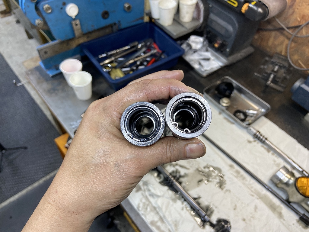 インナーチューブのボトム側を比較します。左右で使われているスナップリングが違いますね。画像左側が正規のスナップリングで、2つ穴部分の低い特殊なものです。画像右側はピースに傷のあった方で、通常のスナップリングが使われています。