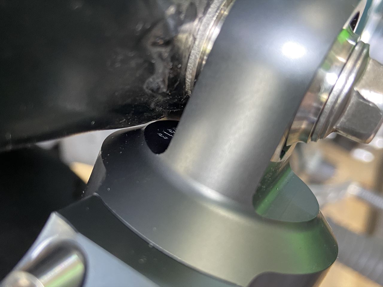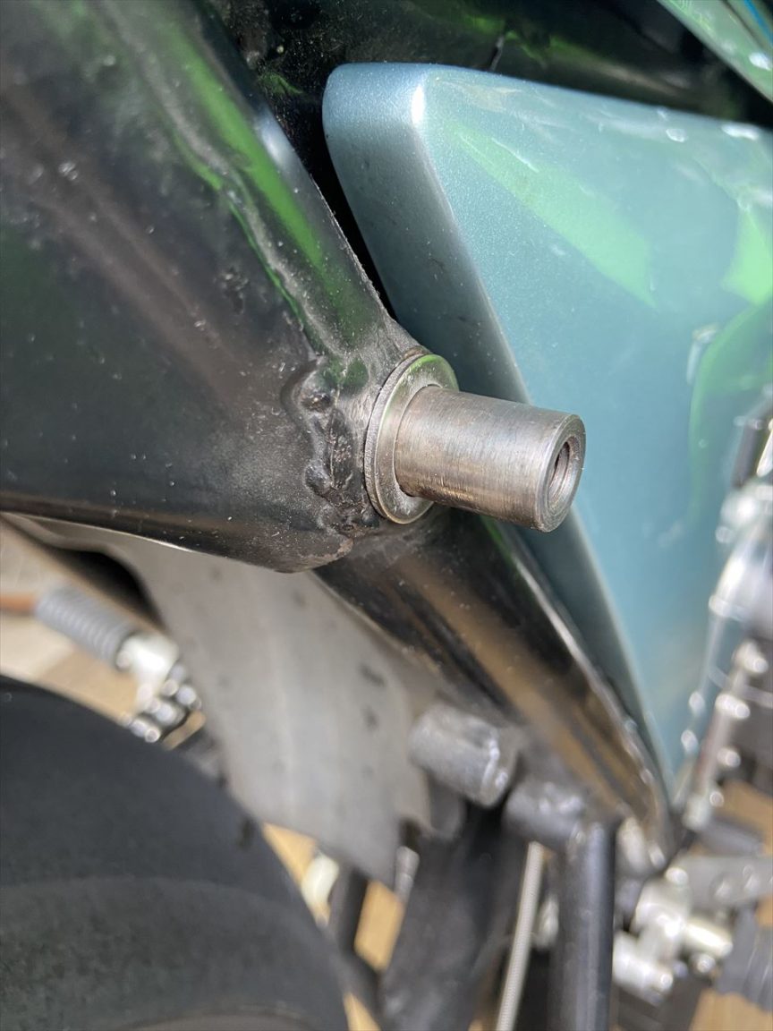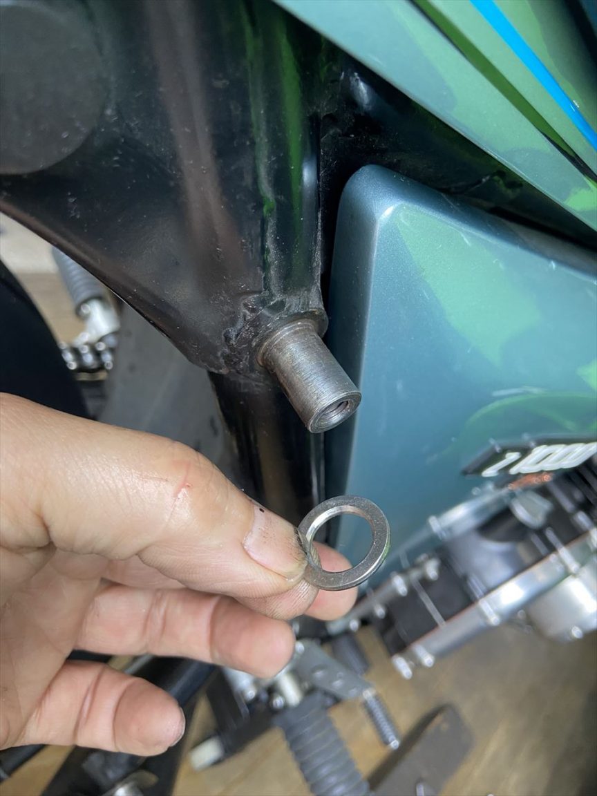 取り付け確認したところ、ショックの肩のところとフレームのガセットが僅かに干渉します。2ミリのスペーサーを入れて対策します。
