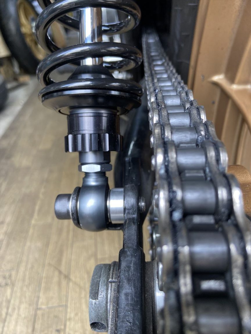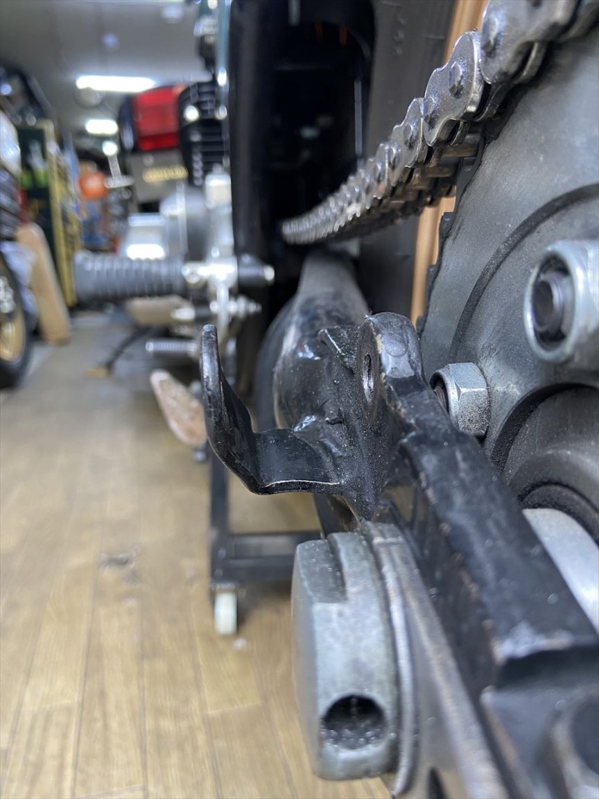左下のサス受けは、以前、チェーンとスプリングの干渉を避けるために少しオフセットさせていました。今回はエンドアイのふくらみがステーに干渉するので若干曲げなおします。