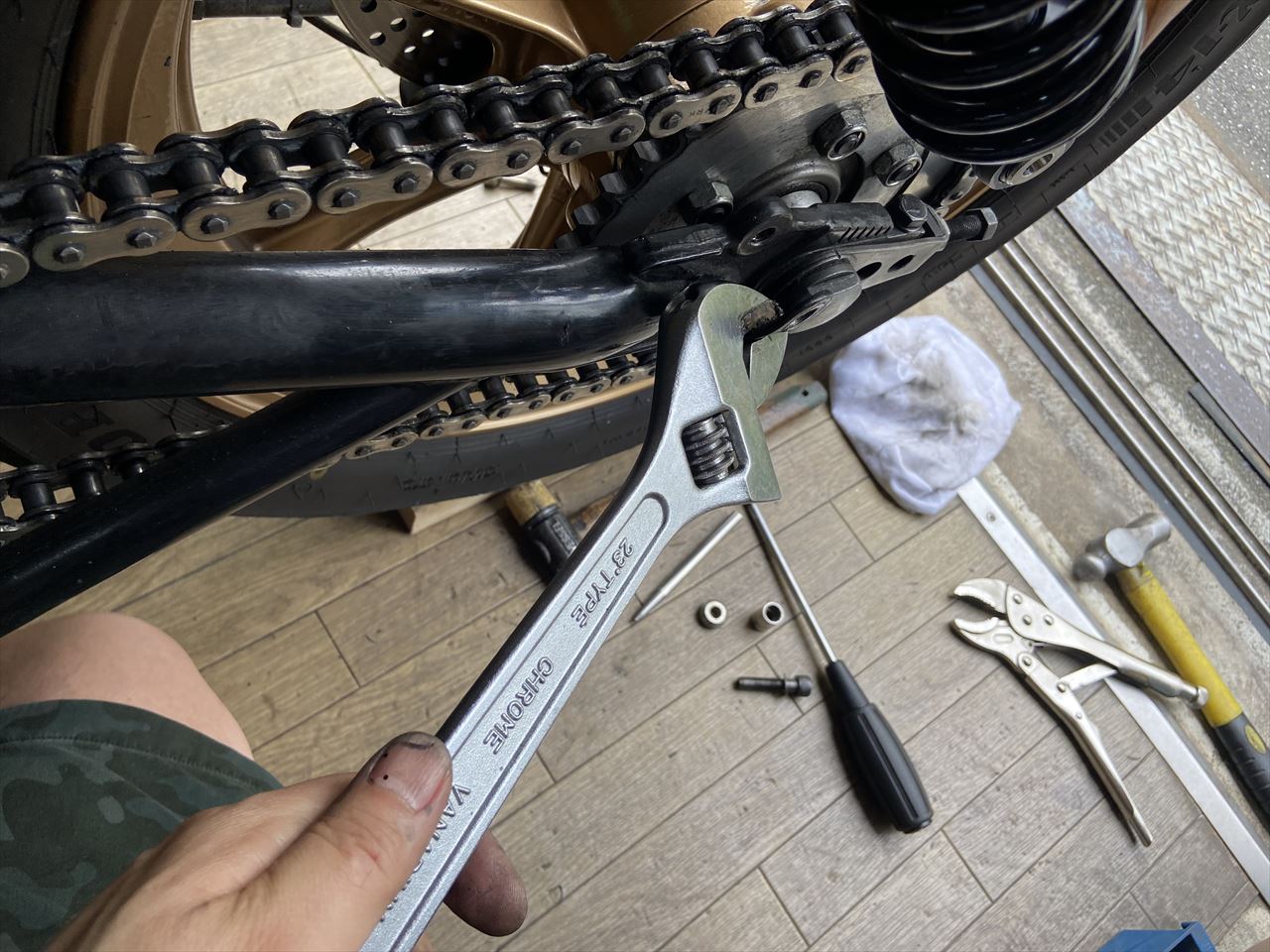 チェーンとスプリングのクリアランスはこのくらいです。リヤスプロケに近いので、チェーンがバタついてもほとんど干渉しないでしょう。