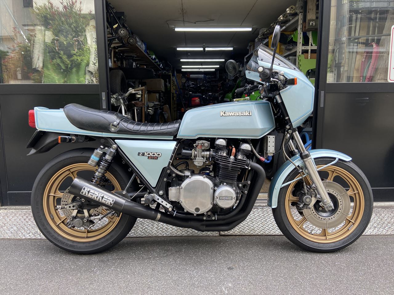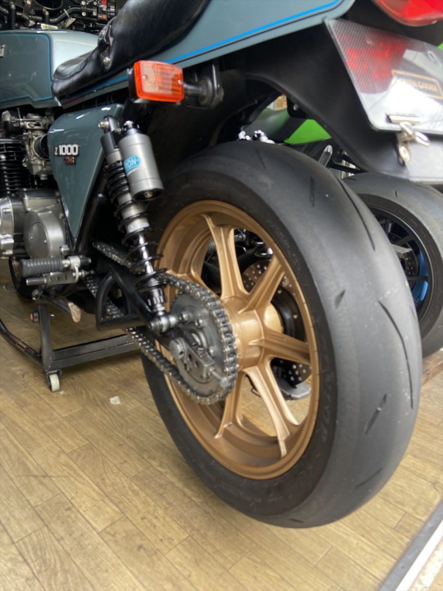 ナイトロンのリヤショックはこちら。GREEN GARAGEオリジナルスペックのスペシャル品です。全長は365ミリ、アジャストでプラス10ミリまでOK。スプリングは中型車用のレートの低いものを使用。1人乗りに特化したスペックで、モノサスのようにしなやかに動きます。