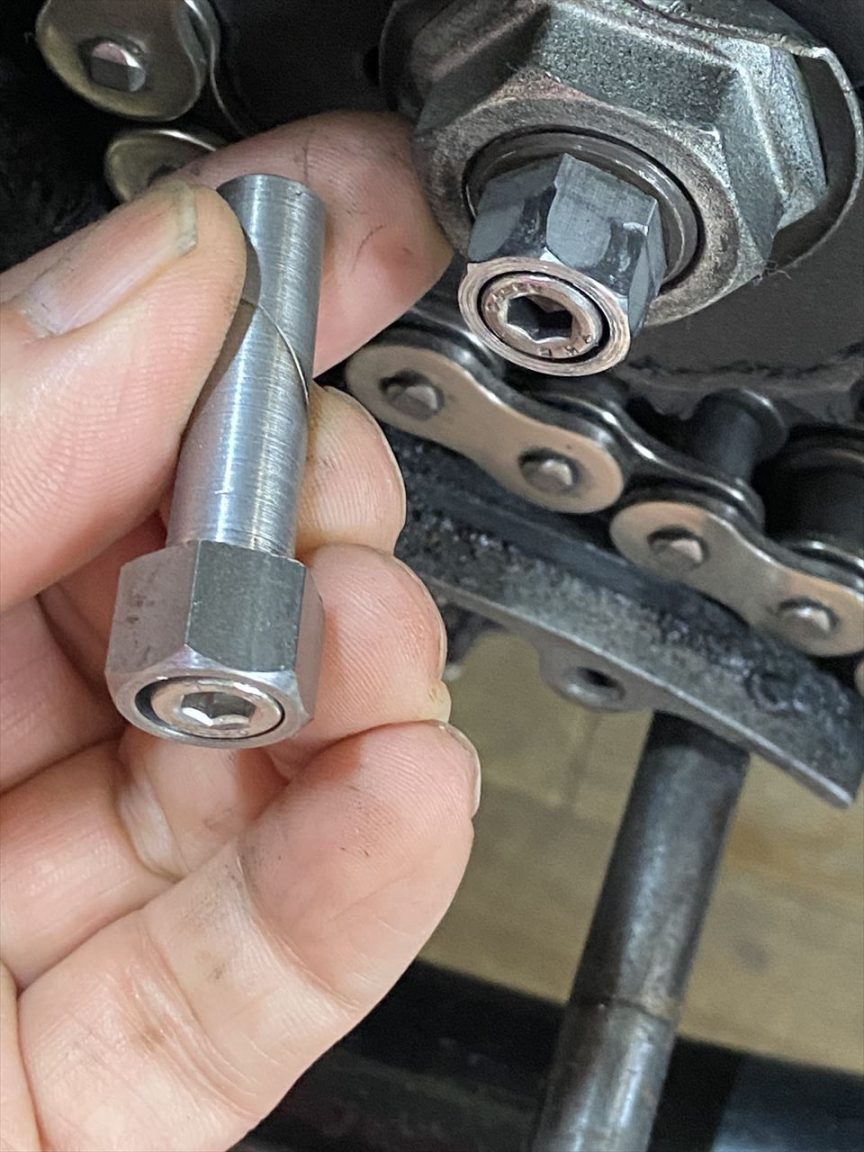 ピンを差し替えます。表のキャップボルトを締め込むことで、奥のナット部が斜めの面をスライドして内部から押し広げて固定されます。