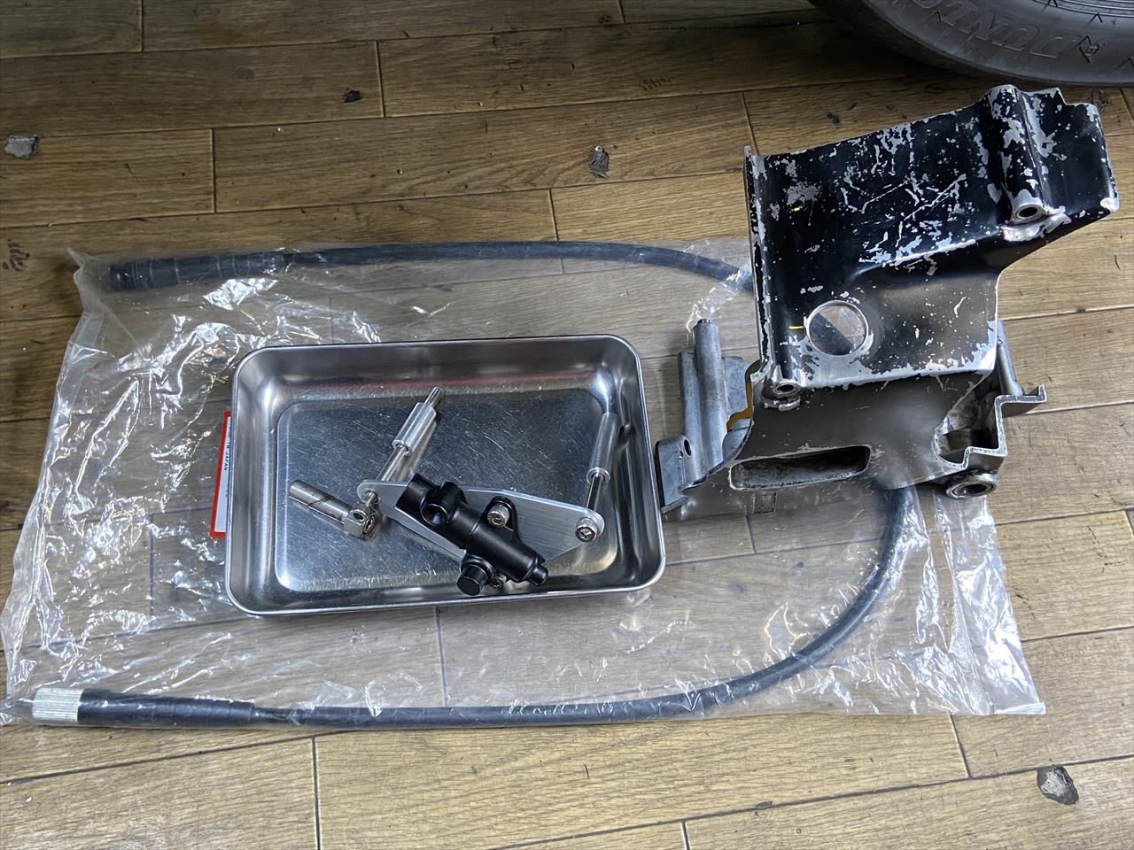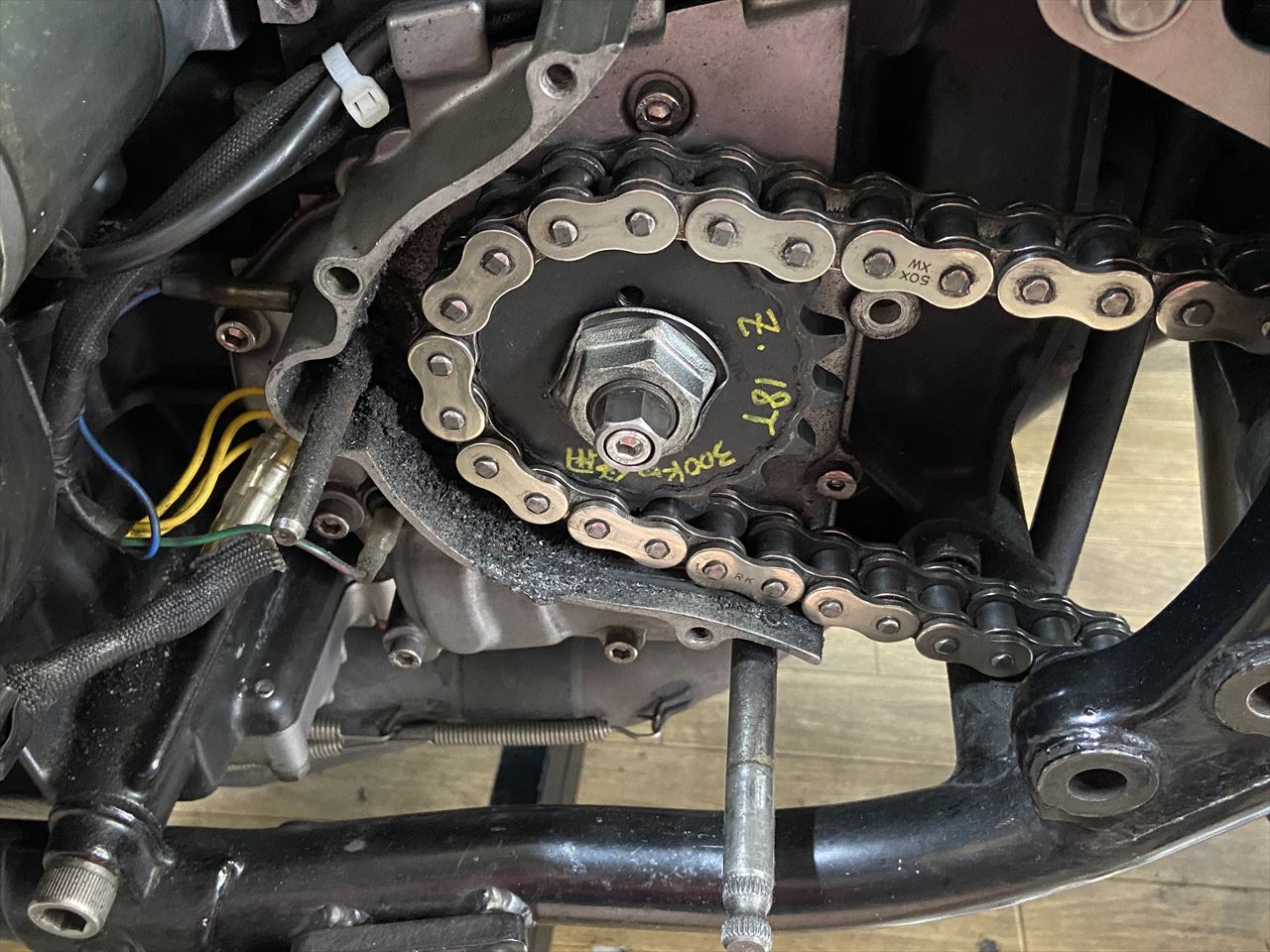 ご注文のあったZ1000Mk2用のスピードメーター取出しキットができたので、デモ車のZ1Rで取り付け確認します。画像のスプロケットカバーはお持ち込みいただいたものにケーブルを通す穴を開けてあります。