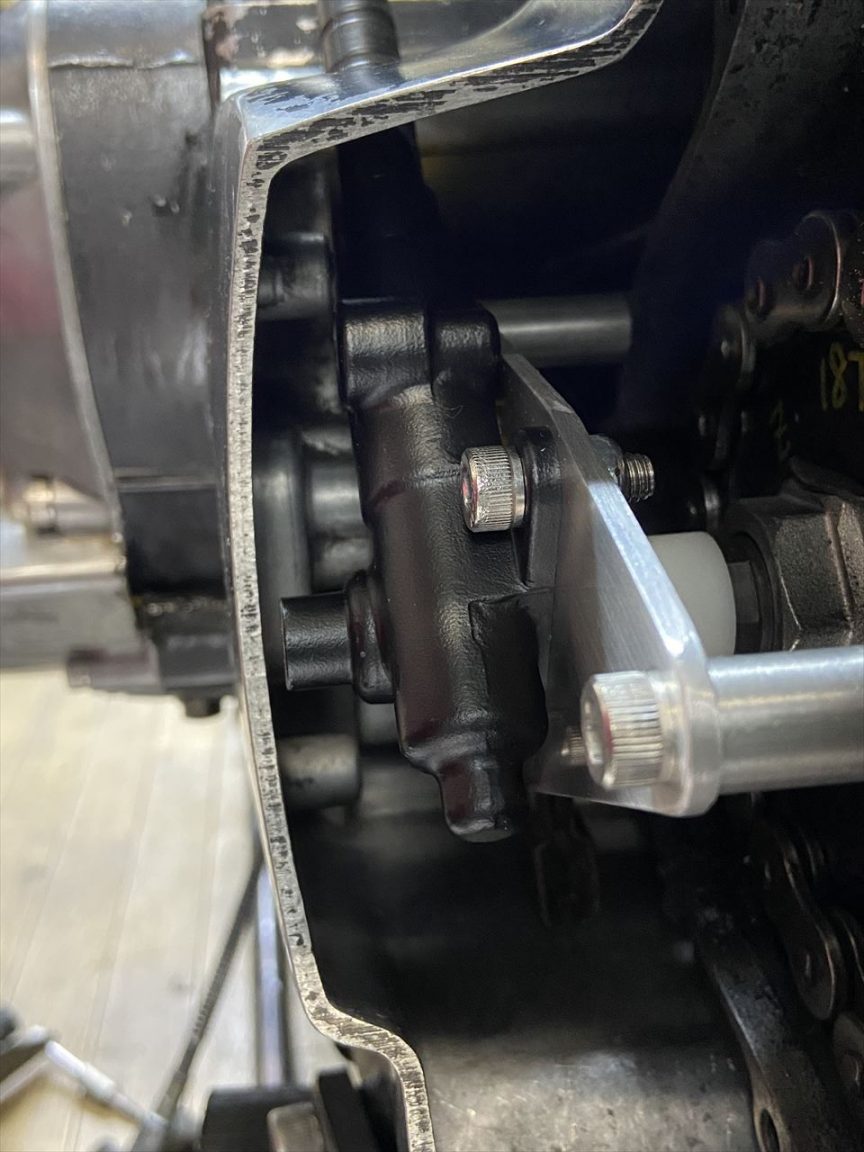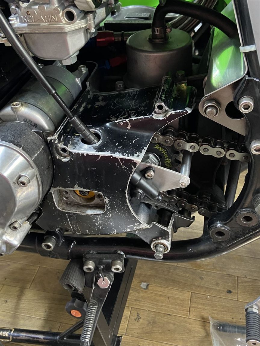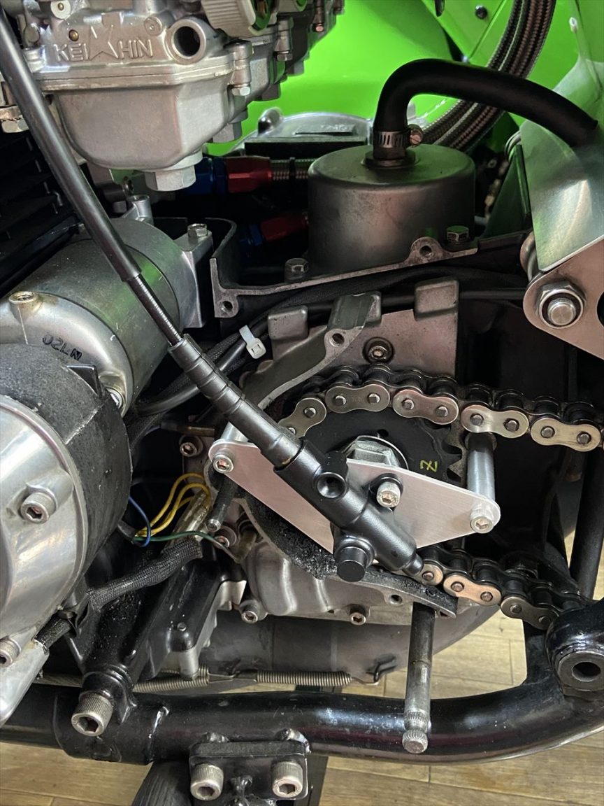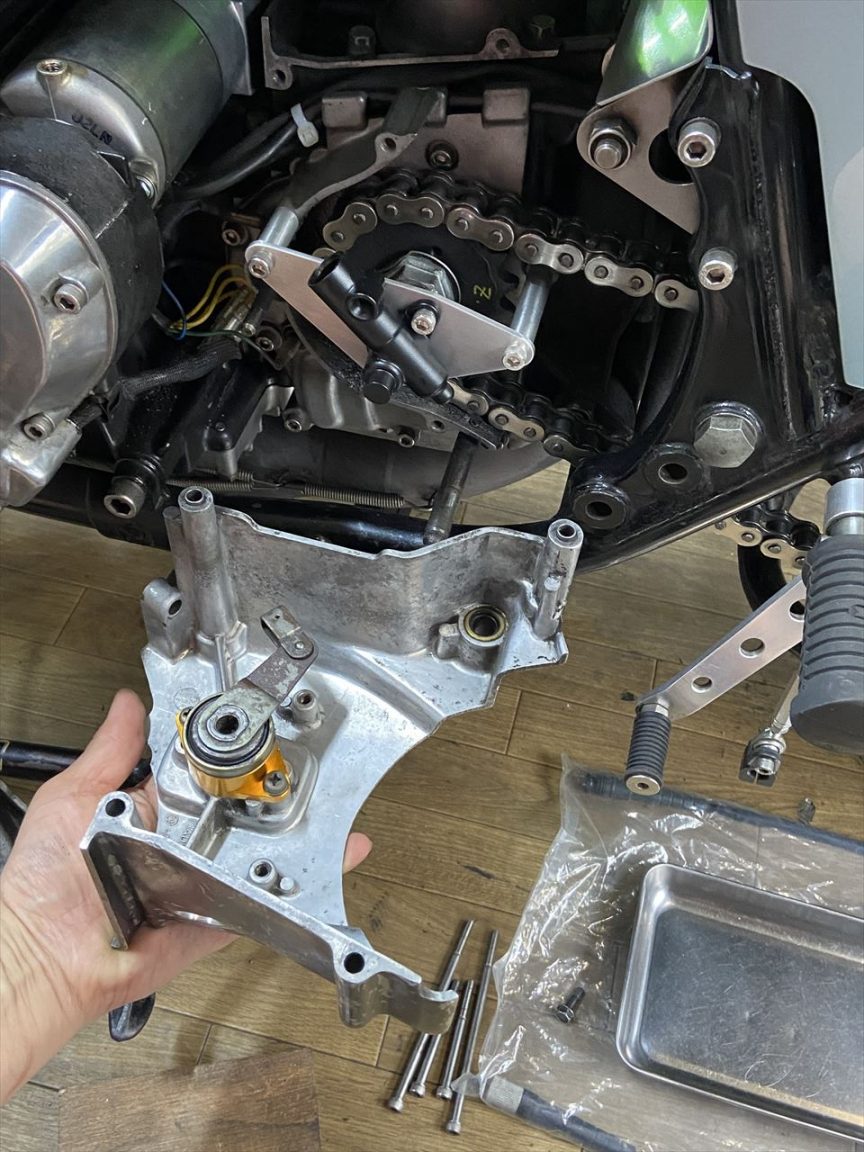 お持ち込みのスプロケカバーを取り付けます。PMCのイージークラッチキットが装着されています。
