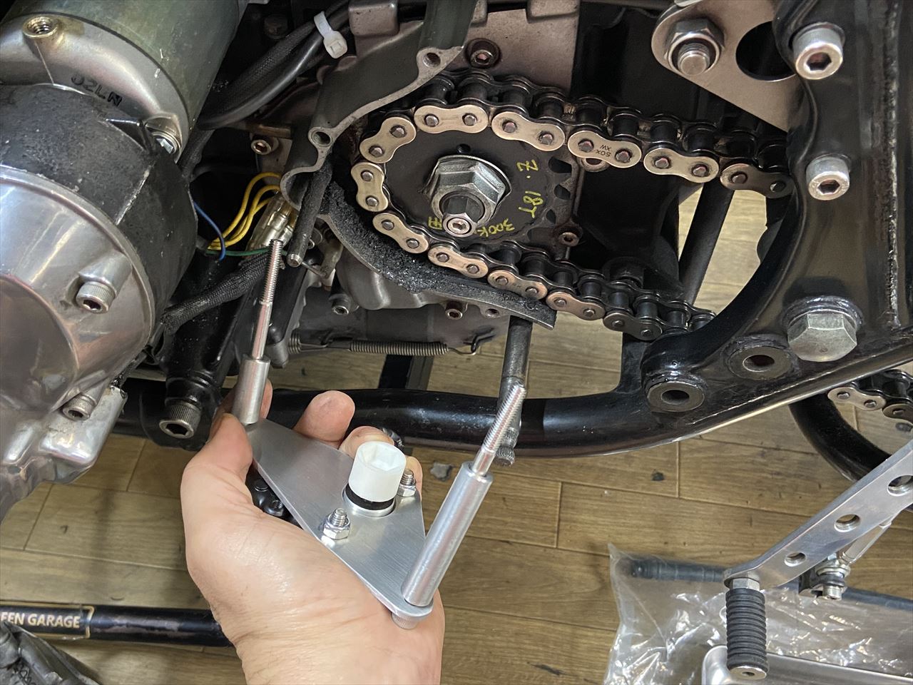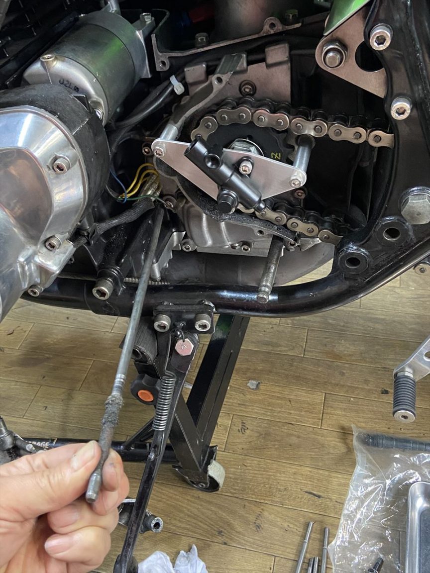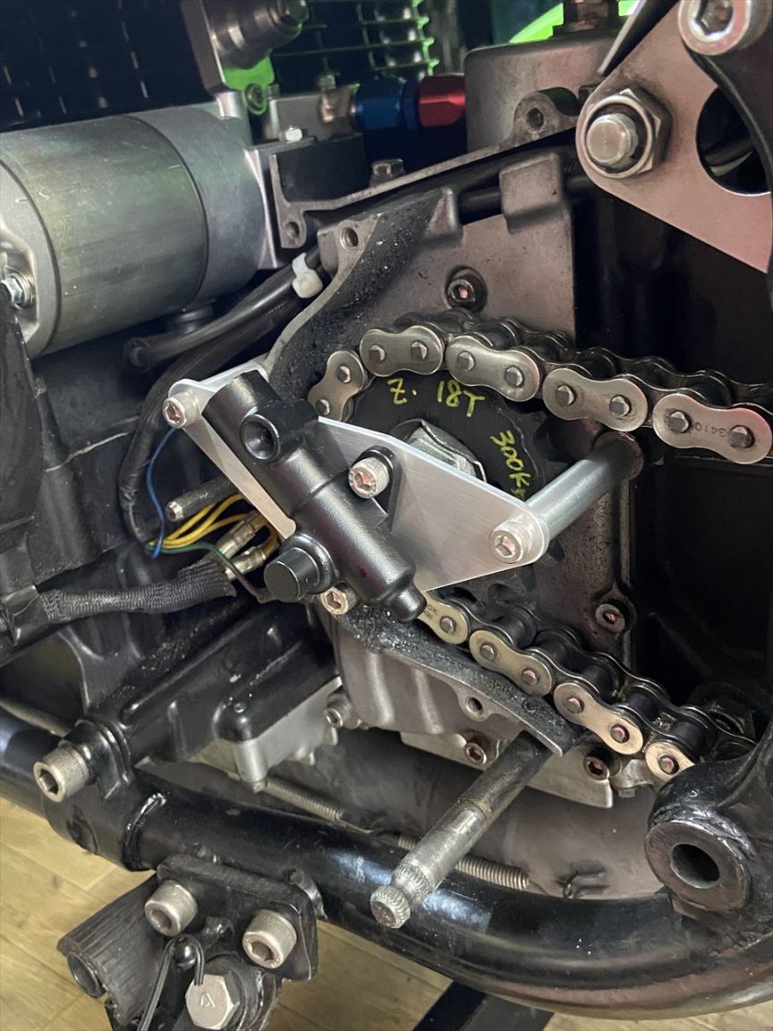 お持ち込みのスプロケカバーを取り付けます。PMCのイージークラッチキットが装着されています。