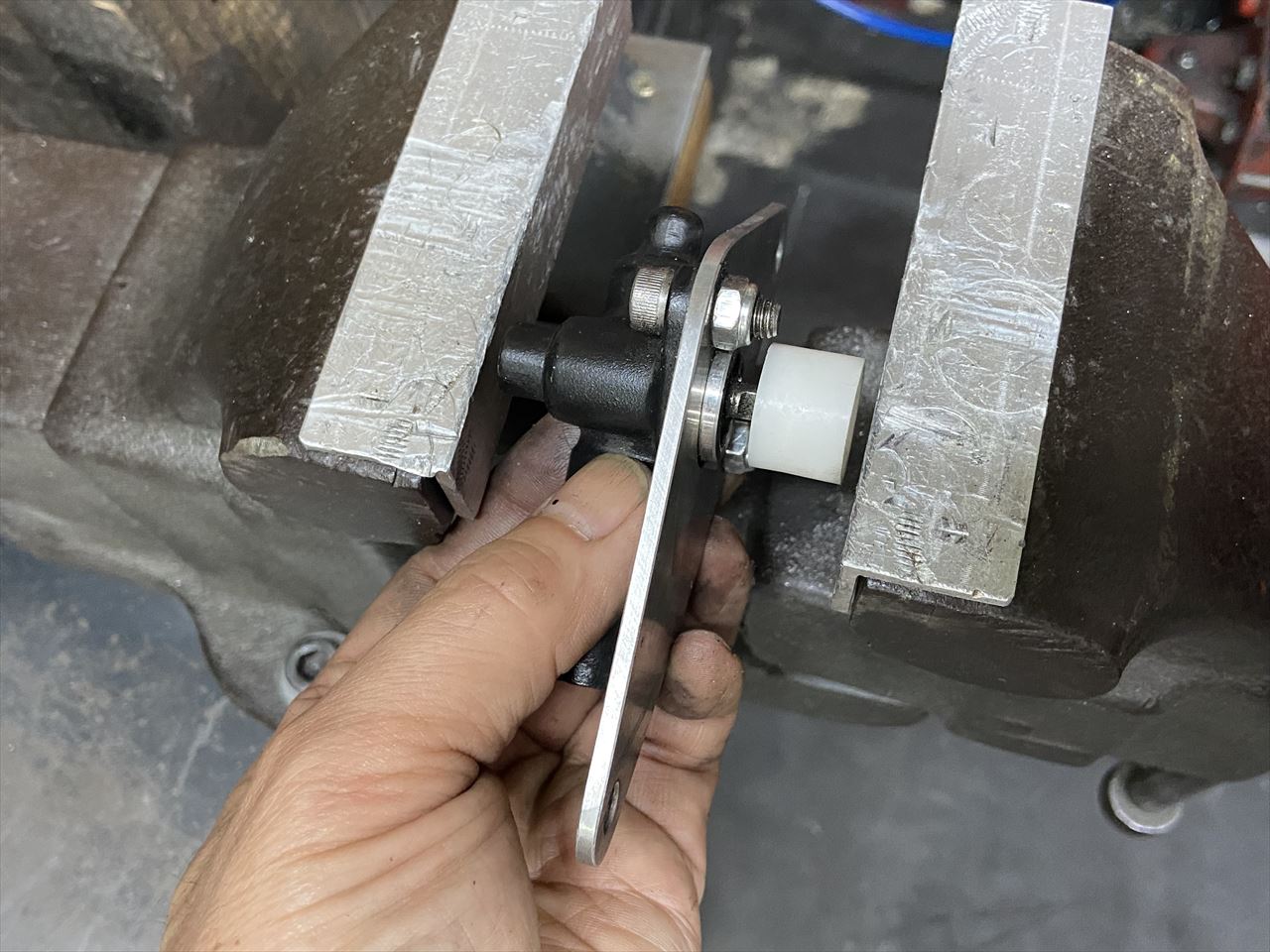 新しいカップリングをバイスなどで圧入します。強く押しすぎると貫通してしまうので要注意。
