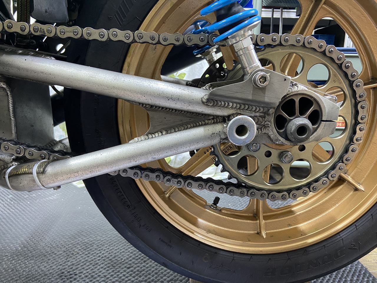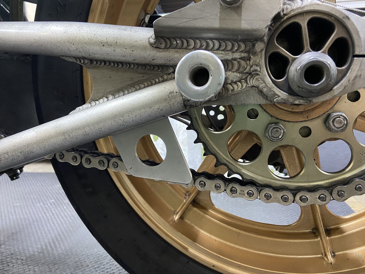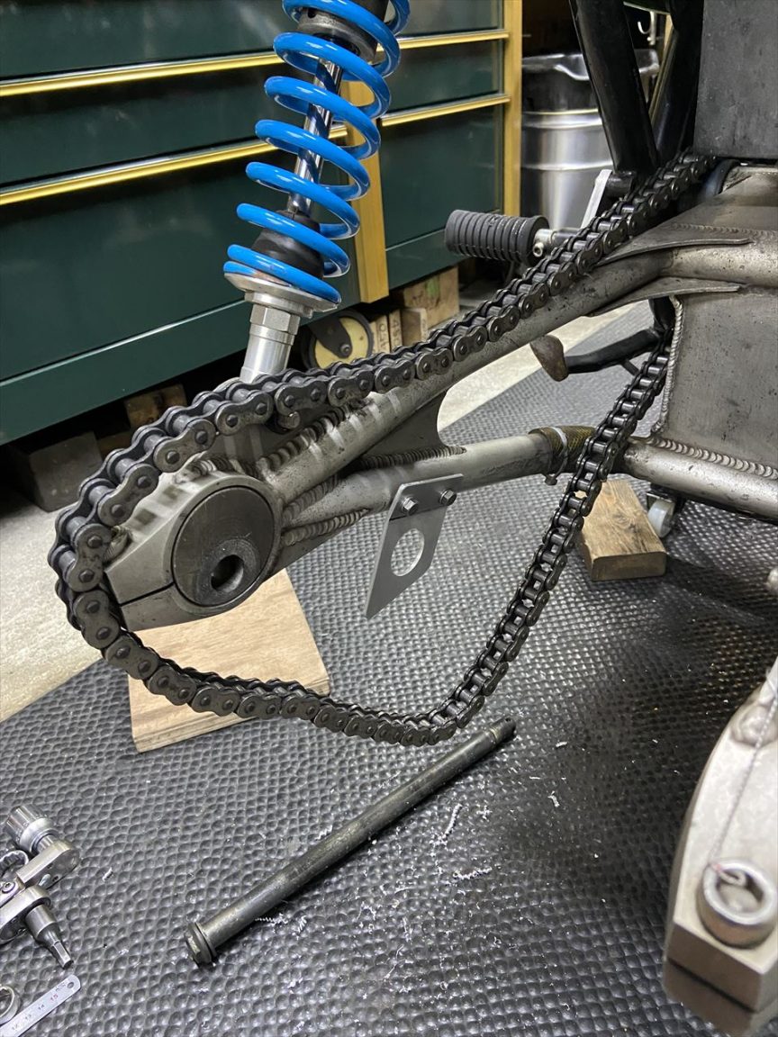 TOTのレギュレーション対策も追加でひとつ実施します。スイングアームにチェーンスプロケットガードを設けます。今まではスタビ部分がガードを兼ねるという解釈でしたが、さらに隙間を小さくせよという見解でした。