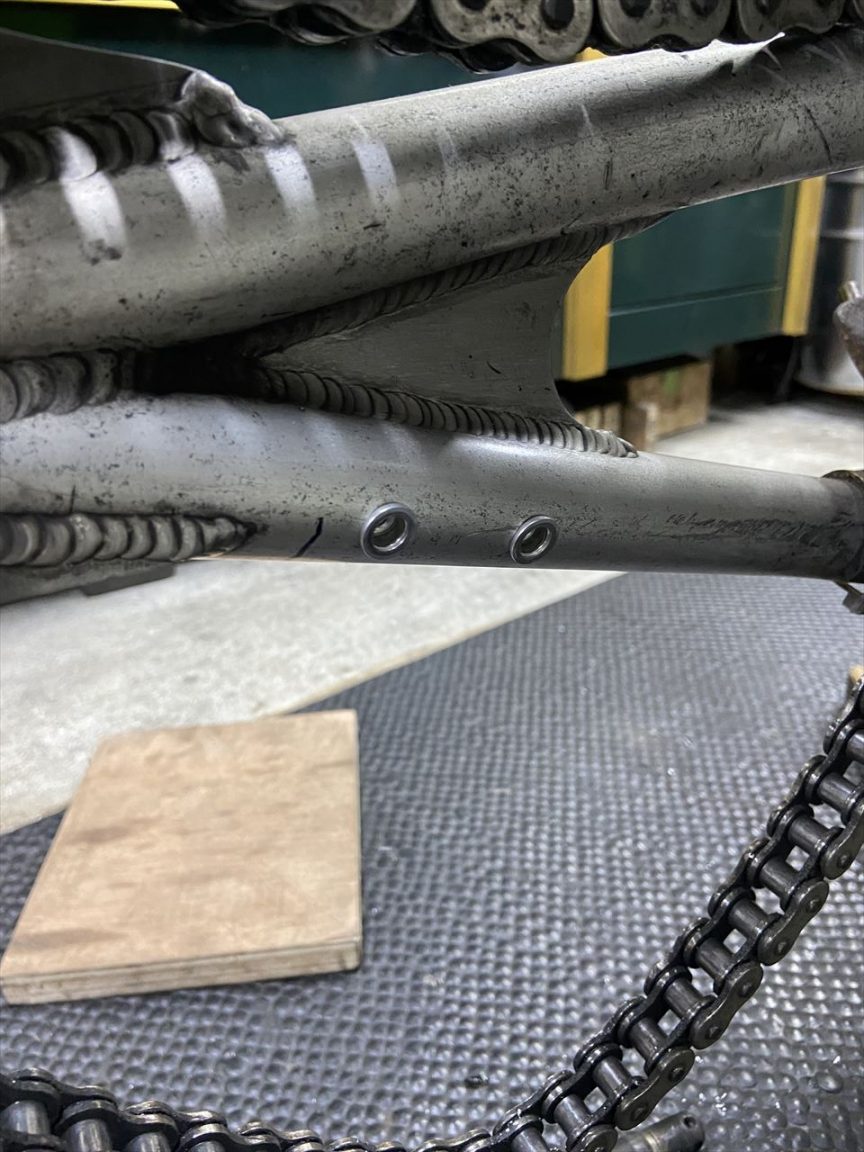 アッパーとロアーのブラケットを溶接でフレームに仮付けします。