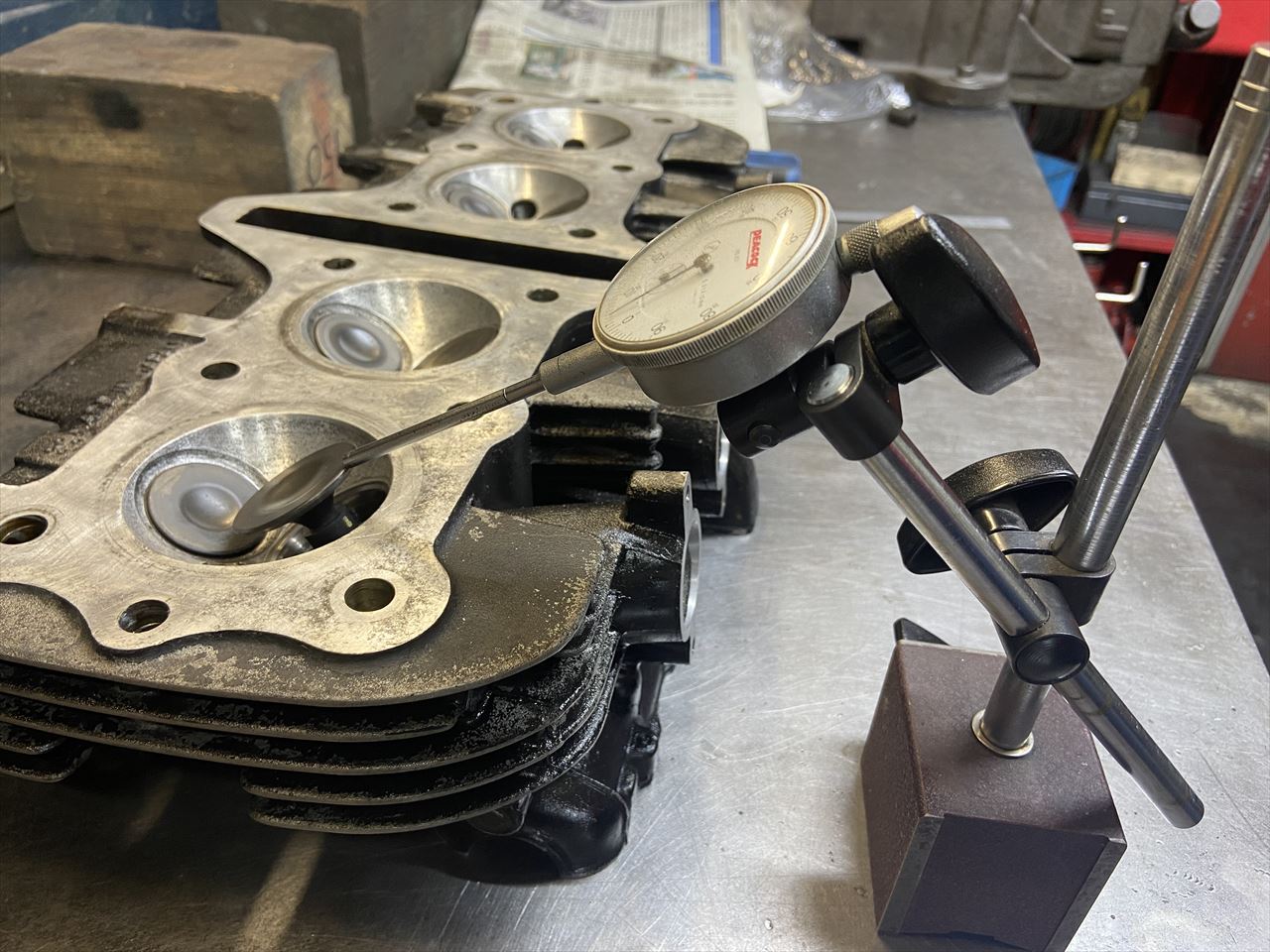 新品バルブを仮組し、ガイドのガタなどを計測します。