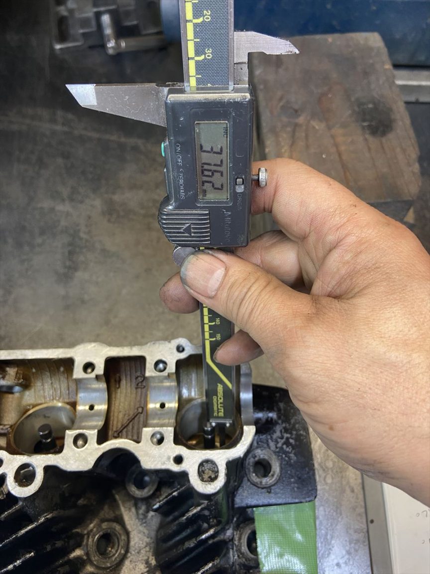 新品バルブでのステムハイトは、8ヶ所とも約37.6ミリ前後です。シートカットは1度も行われていないようなので、想定していたシートリング交換は必要無くなりました。プラグホールとシートリング間のクラックも数か所見られるので、シートリングを交換しないで済むことにこしたことはありません。