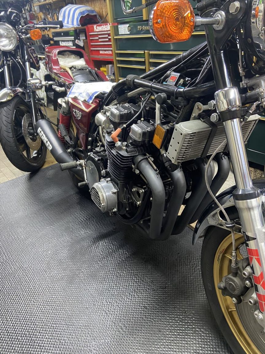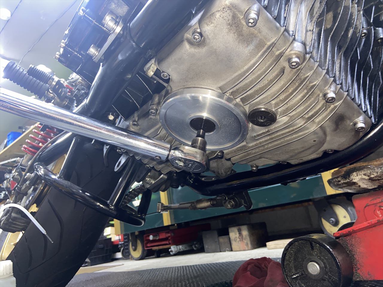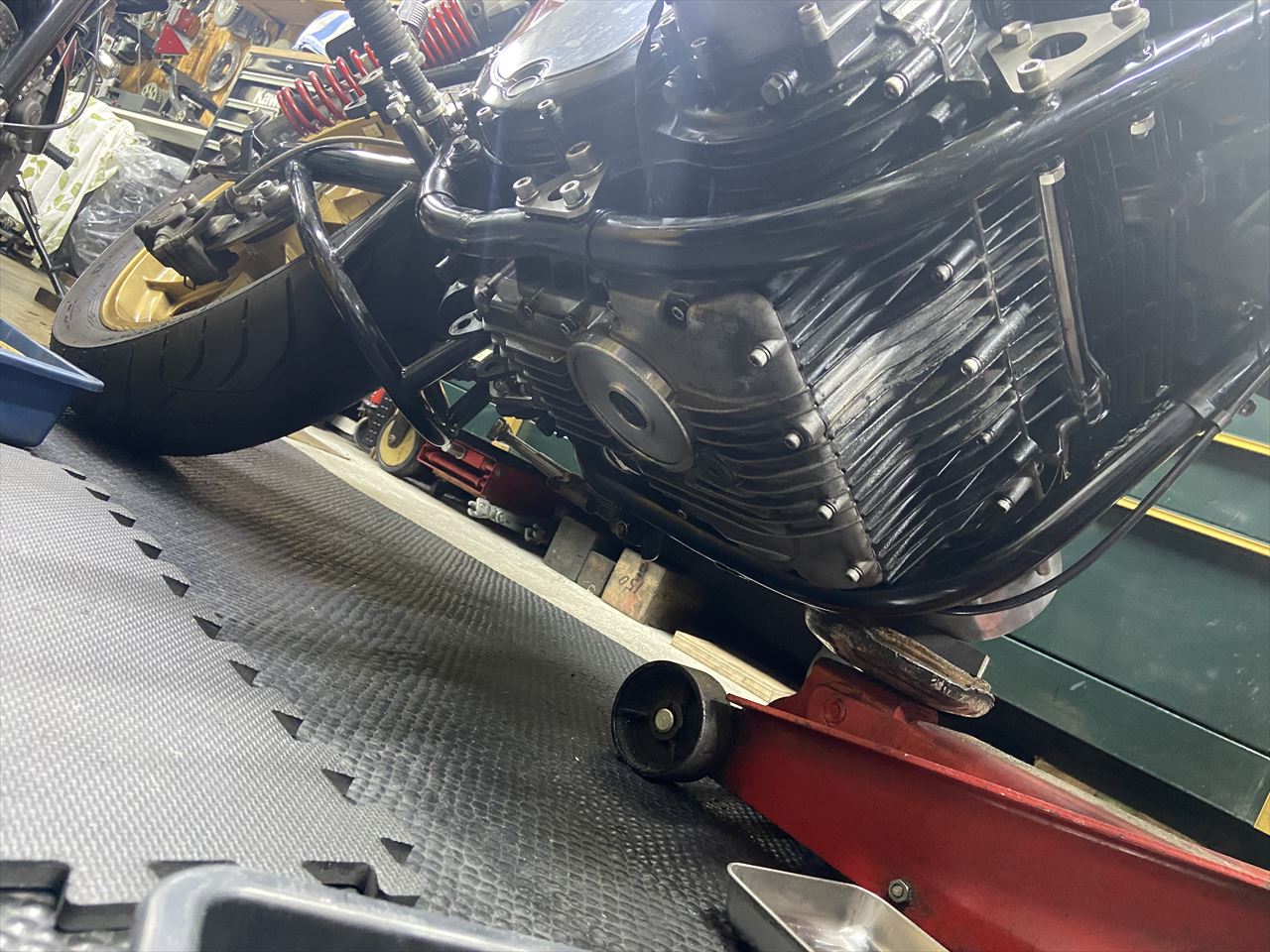 バイクはエンジン腰上を分解組立終了した直後で、マフラーを付ける前に少し寝かして作業を行います。