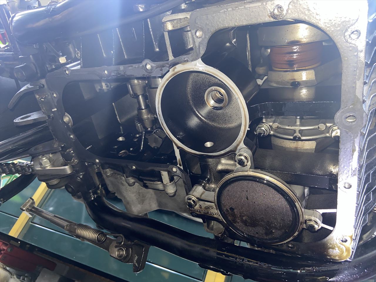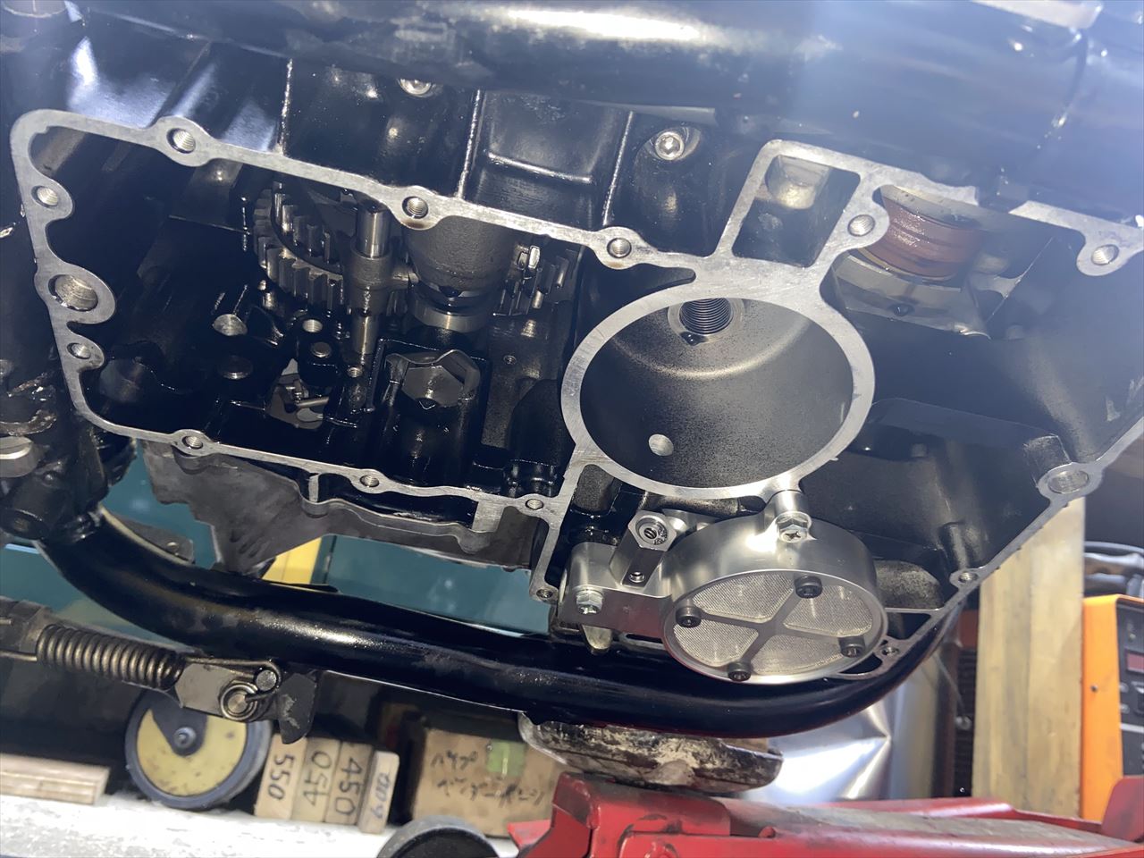 お持ち込みのサンクチュアリ製ハイプレッシャーオイルポンプを取り付けます。ポンプはノーマルのギヤ式から一般的なトロコイド式に変わり、油圧と油量が大幅に増加します。一般使用でも油温低下の効果が期待できます。
