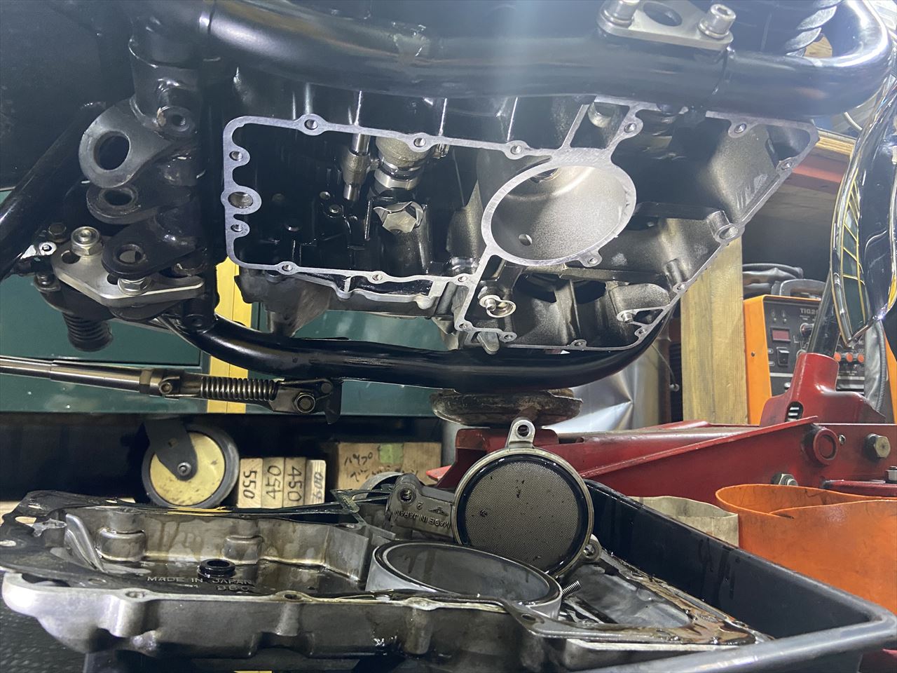 オイルパン内は腰上分解時に落ちたガスケットの破片などが数個あるだけで、他には特に異物も無くきれいです。