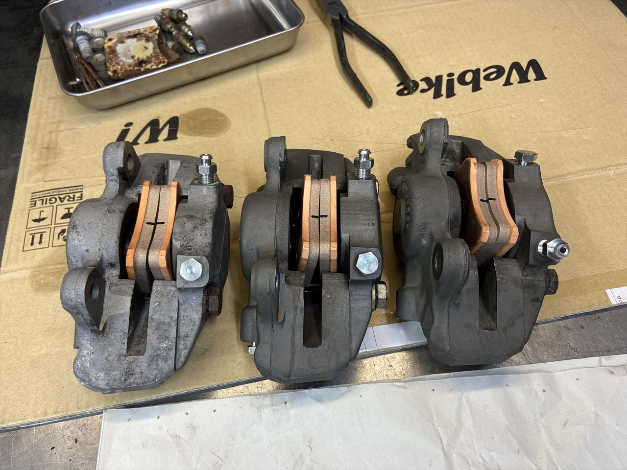 キャリパーは古いものなので分解点検します。使用歴はあまり無いようで、ピストンを掃除する程度で継続使用できそうです。