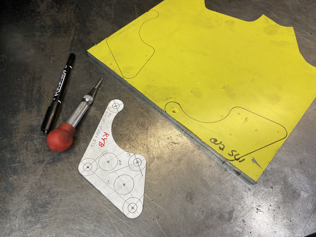 サポートは10ミリ厚のジュラルミン板から切り出します。形状のモチーフはワークス車のサポートです。