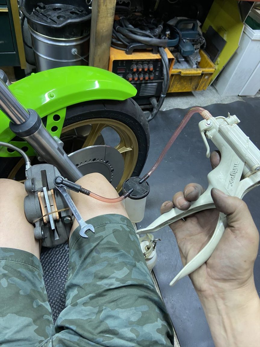製作したホースを取り付けたら、一旦キャリパーを外してエア抜きします。