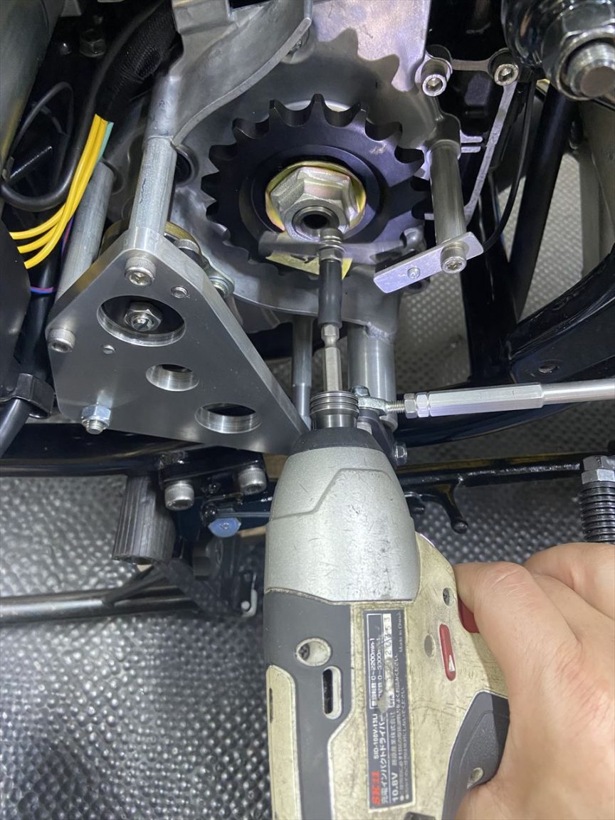 スピードメーターセンサーはアウトプットシャフト側に新設しています。電動ドライバーで疑似信号を作り、スピードヒーラーに最高速を記憶させます。