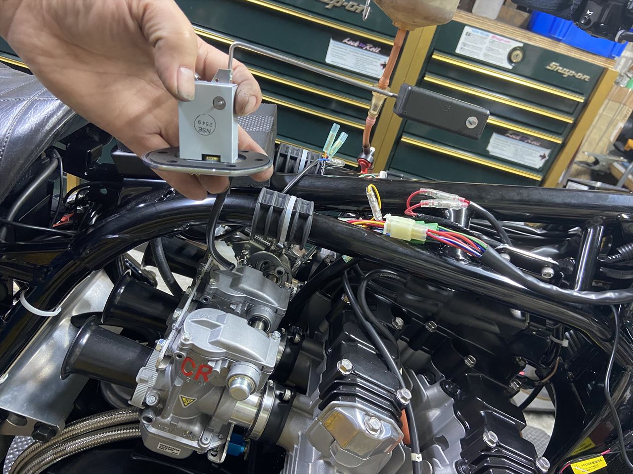 メーター類の動作も確認します。フューエルセンサーを取り付け、フロートを手で上下させてメーターの動きを確認します。