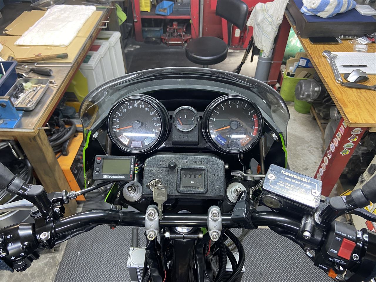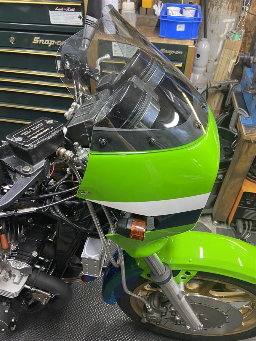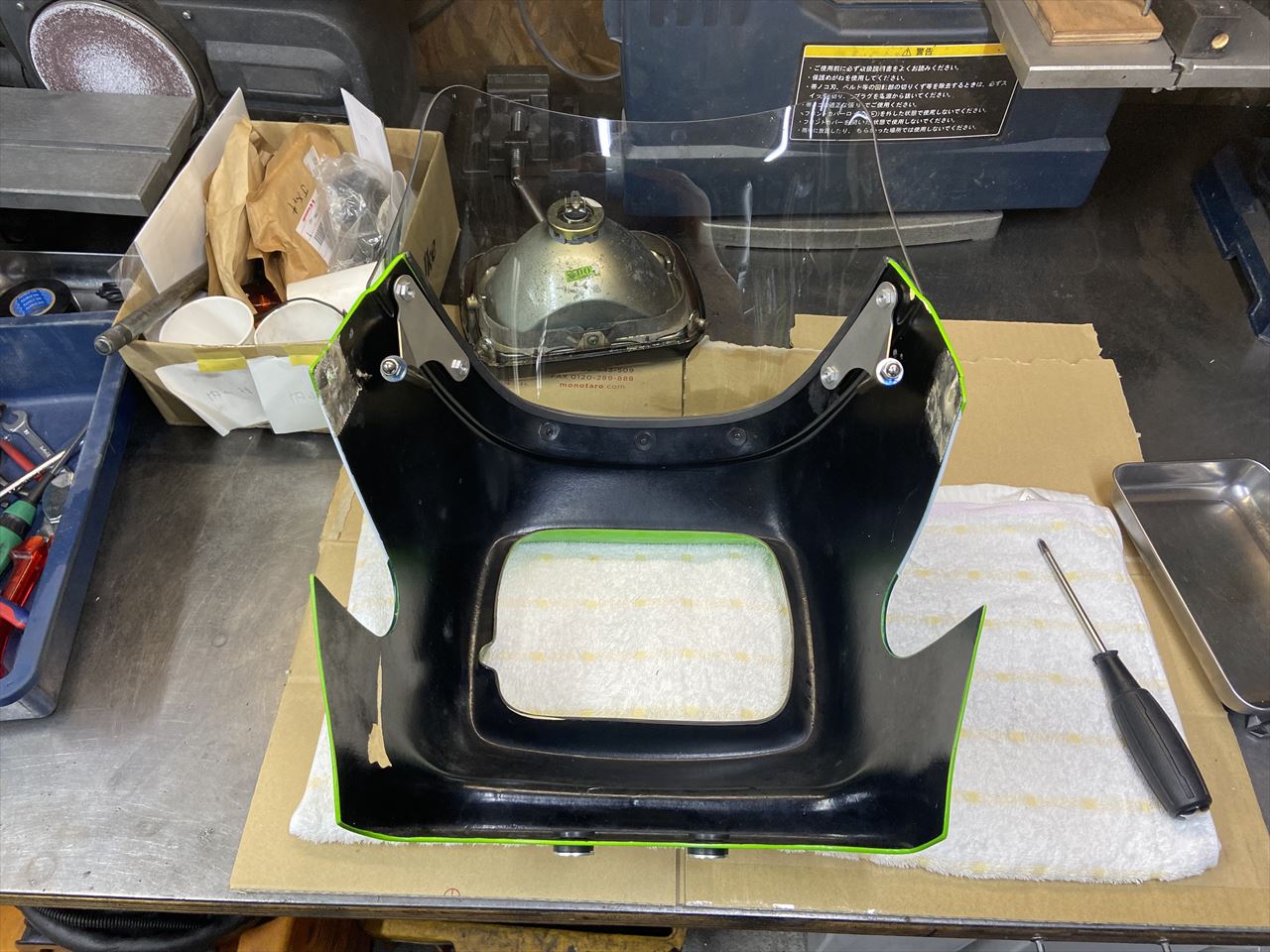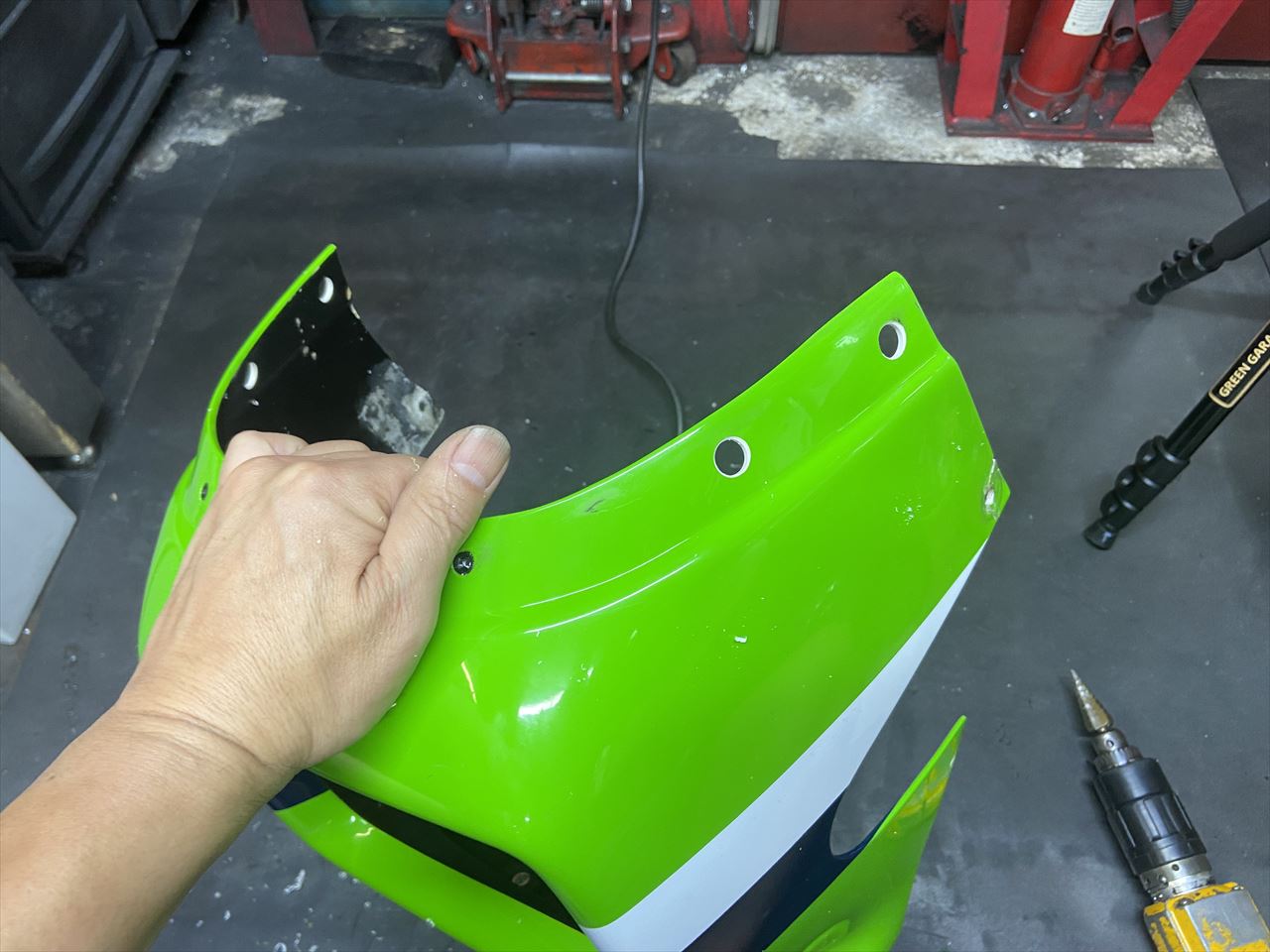 ようやくフロントカウルの位置が決まりました。社外品なので若干穴位置が違うようでした。