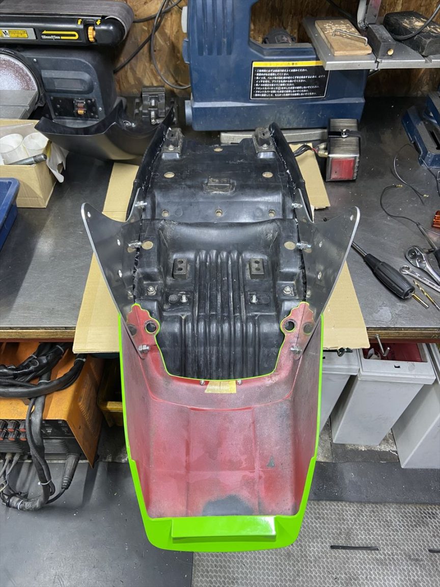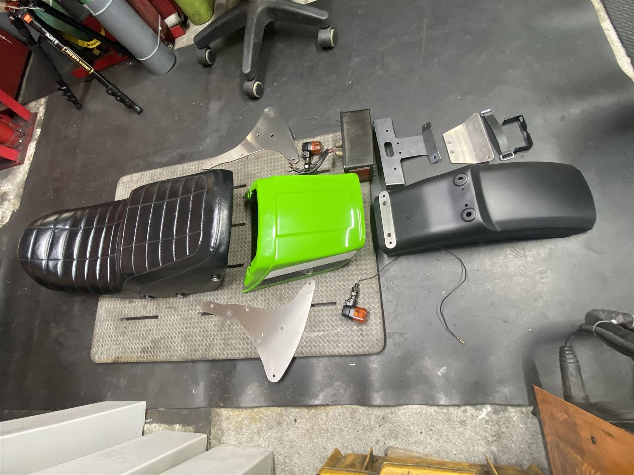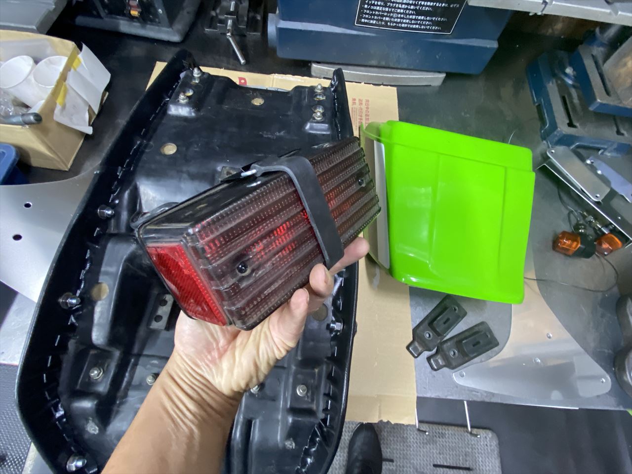 続いてテール周りの加工です。シート、テールカウル、リヤフェンダーなどはS1同様に全て一体化します。公道仕様なのでテールランプとウインカー、ナンバープレートも装着します。