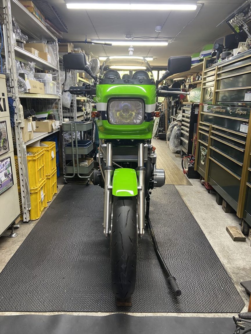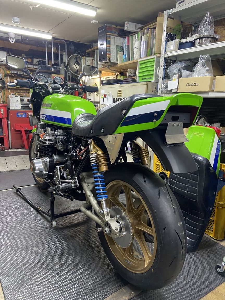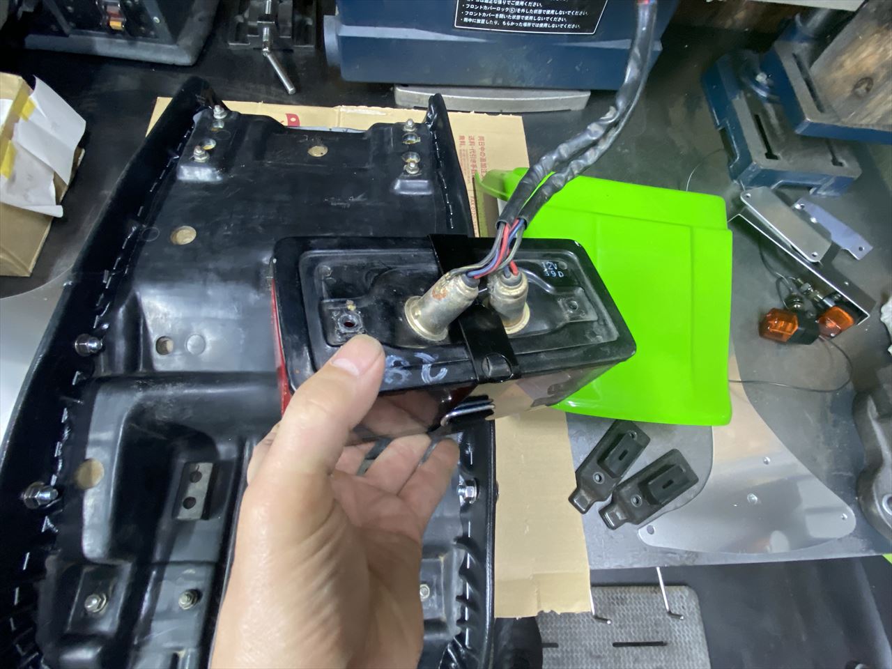 続いてテール周りの加工です。シート、テールカウル、リヤフェンダーなどはS1同様に全て一体化します。公道仕様なのでテールランプとウインカー、ナンバープレートも装着します。