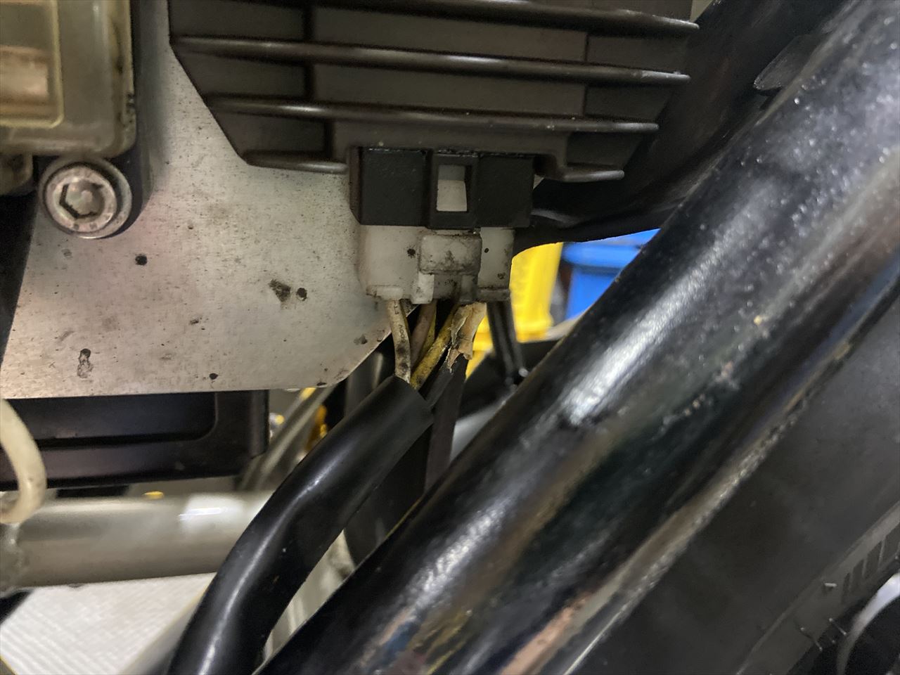 ステーターコイルからの配線は、ギボシの部分が痛んでいました。こちらも腐食からくる抵抗熱で被覆が硬化したり一部溶けています。こちらもよくある現象です。