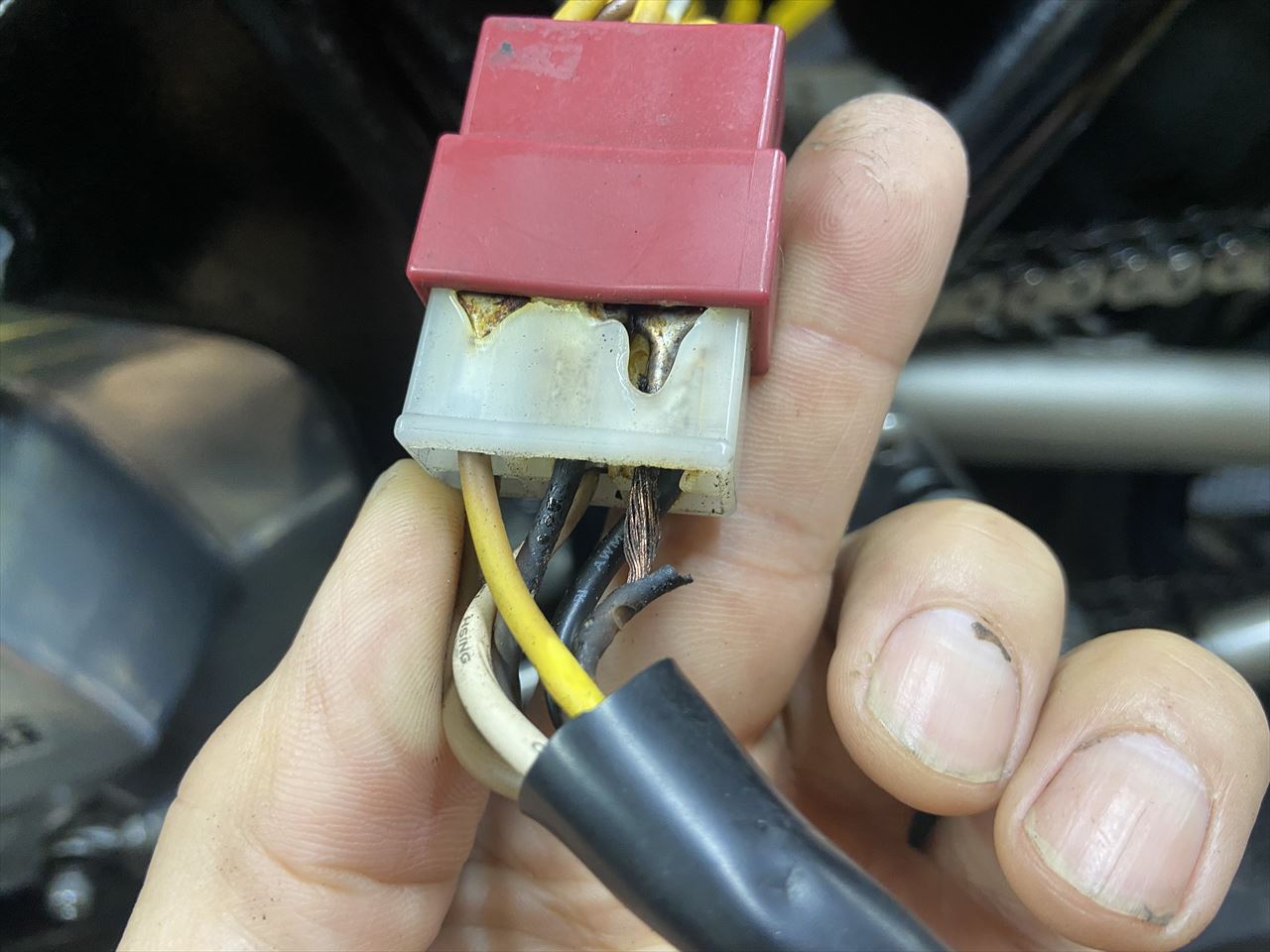 端子の腐食から抵抗熱で溶損したのでしょうか。5年前にコンプリートで販売した車両で、その際、メインハーネスなど電装系は新品を取り付けていました。屋外にシートを被せての保管とのことで、この辺は早期にトラブルとなるようです。