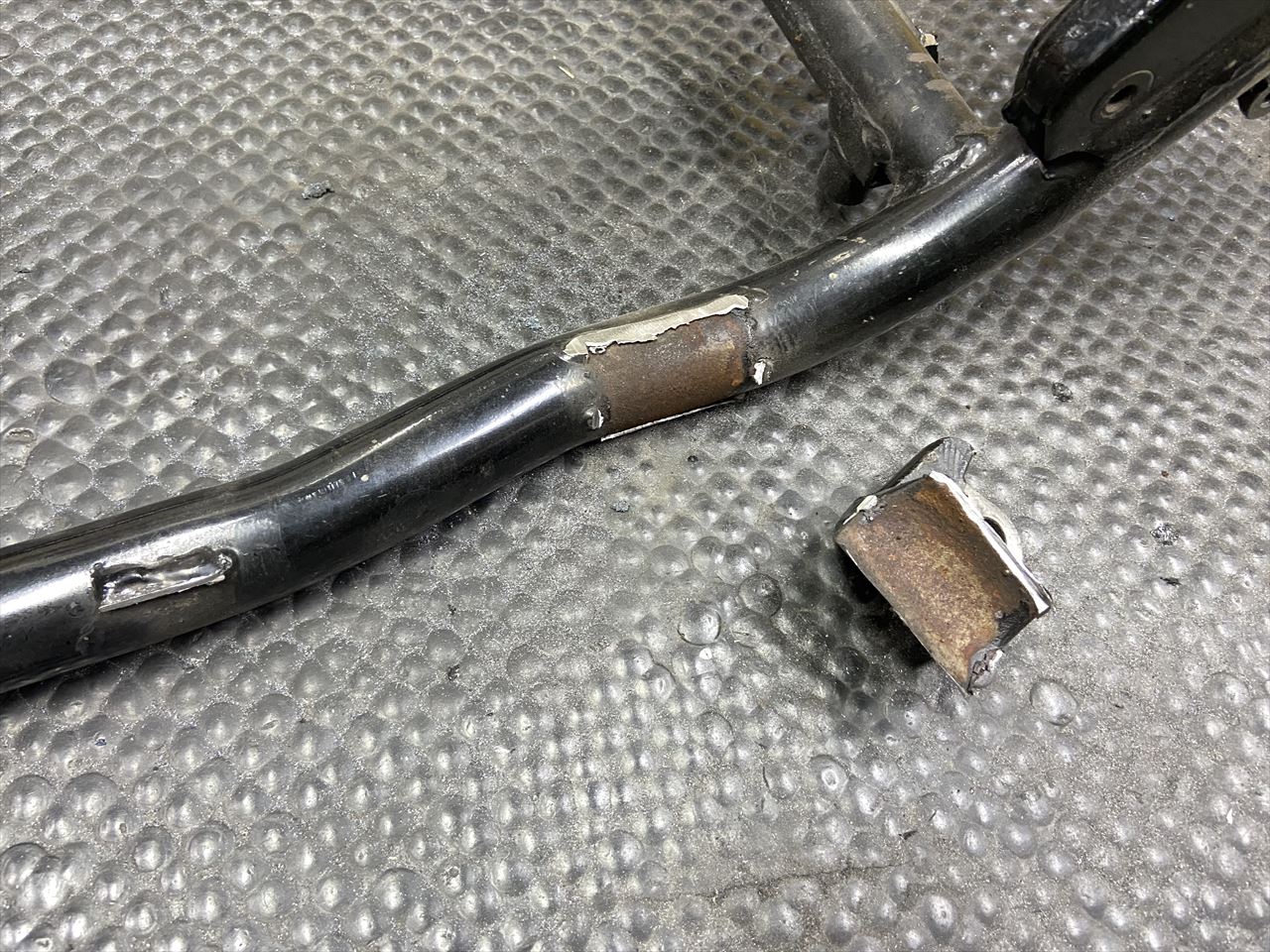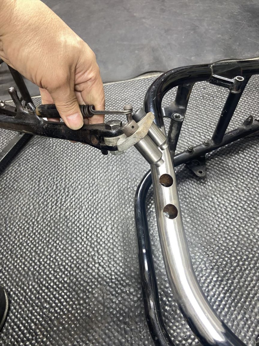 サイドスタンドのブラケットを外します。フレームの錆びは少な目ですね。