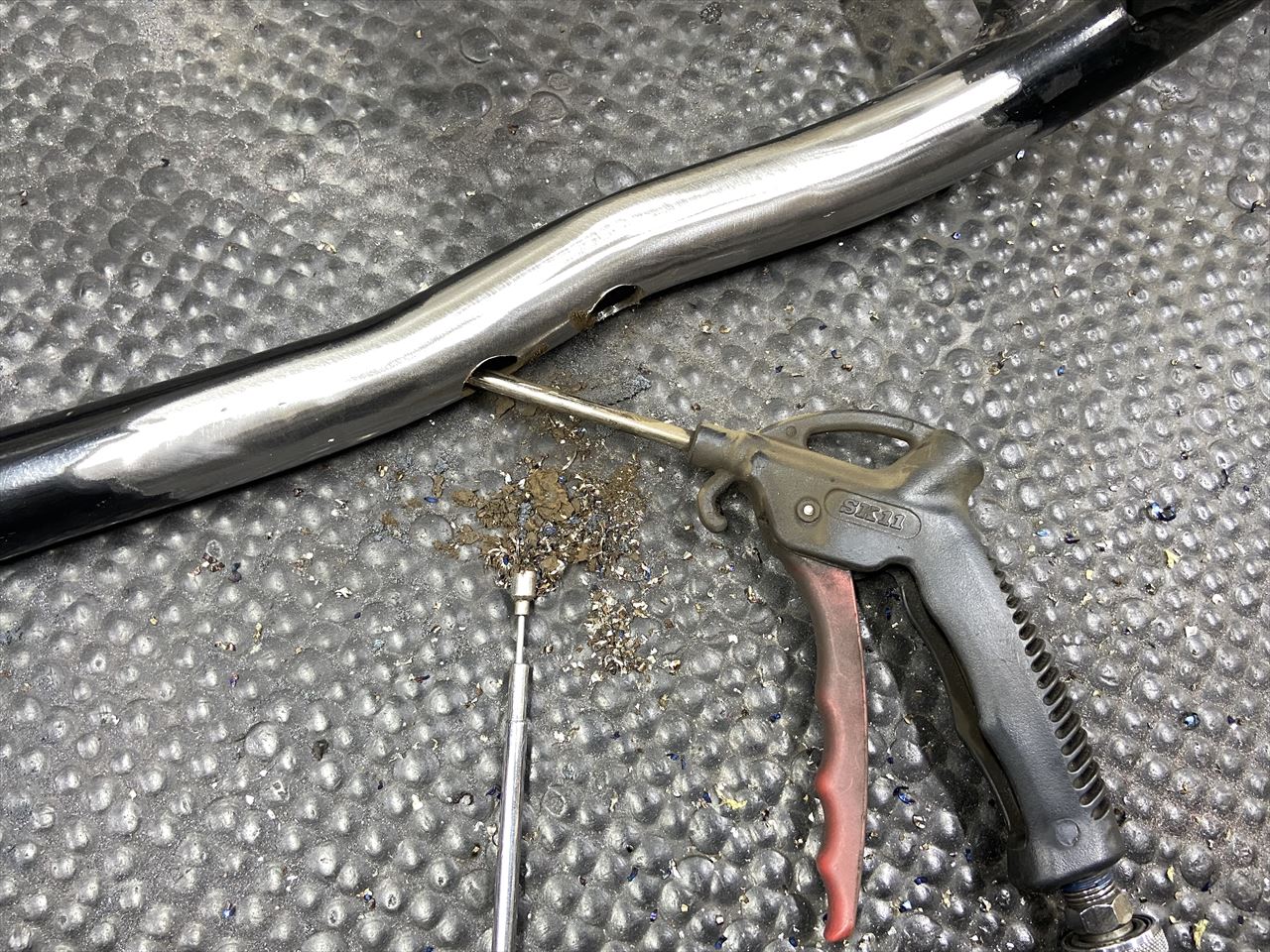 フレーム内部をエアブローします。ゴミは比較的少なめで、フレームの状態はいいようです。