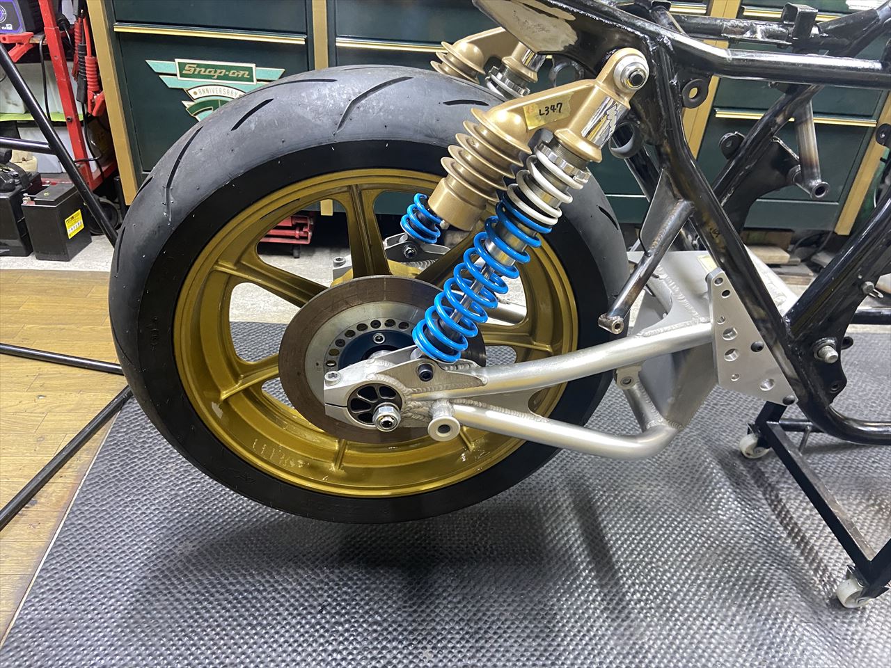 リヤローターは外径φ250ミリで製作されています。スイングアームは当時のキットパーツ本物と思われます。