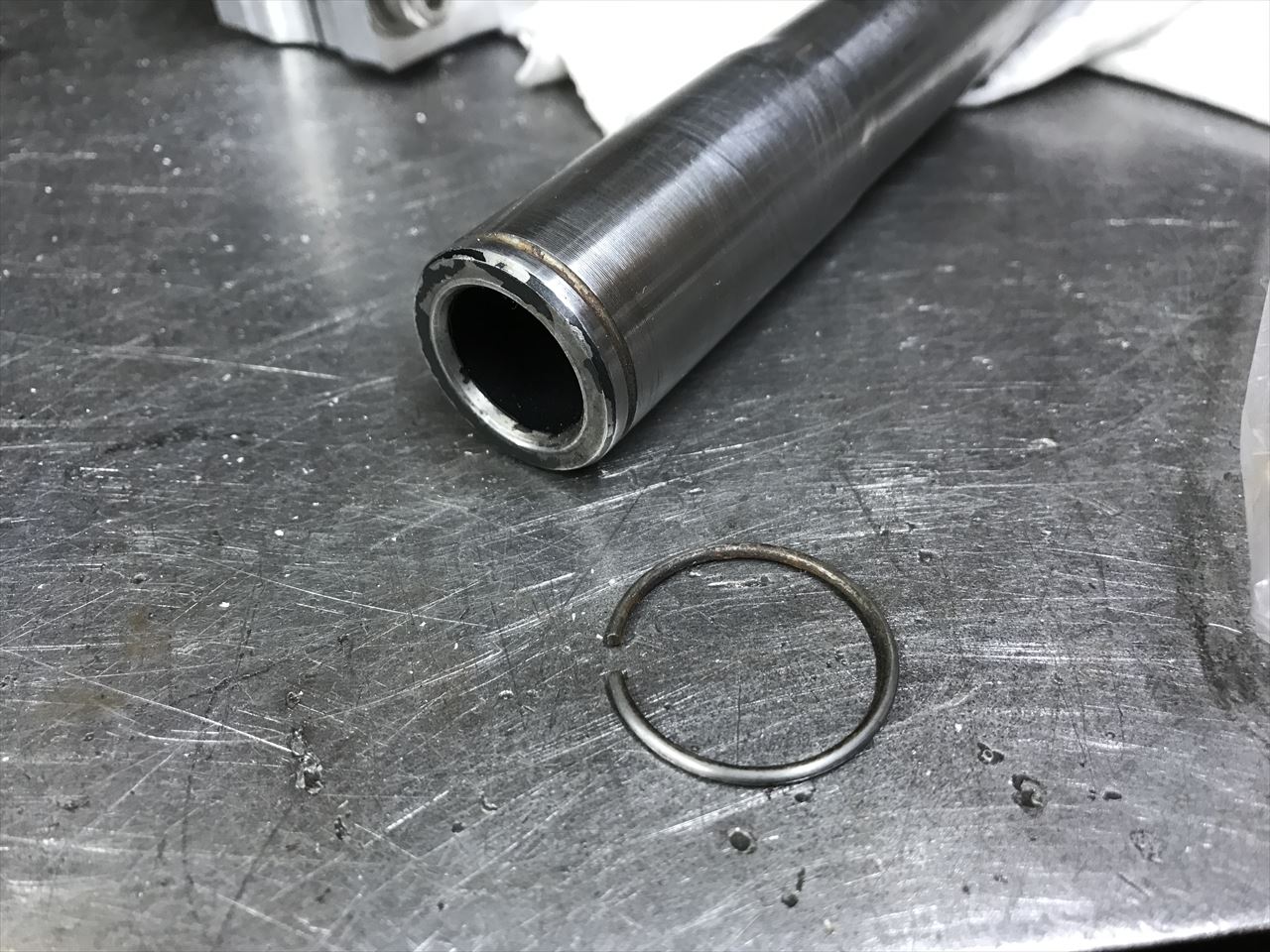 スナップリングが付いていないので、ノーマルシャフトから移植します。
