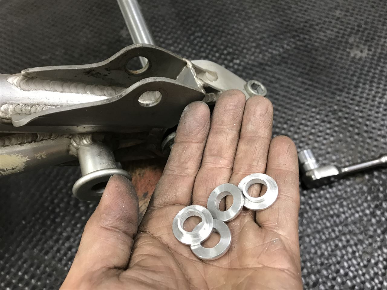 S1スイングアームのサス受けは、段付きのスペーサーを介してショックが取りつきます。そのスペーサーを製作します。