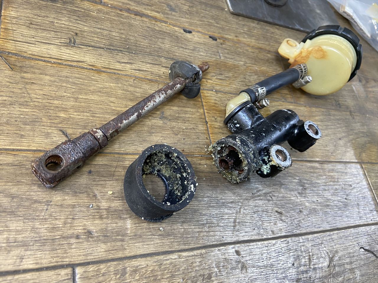 純正のリヤマスターがフルード漏れしているので、新品交換で対処します。