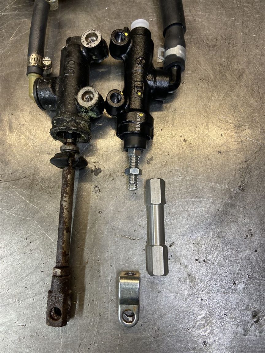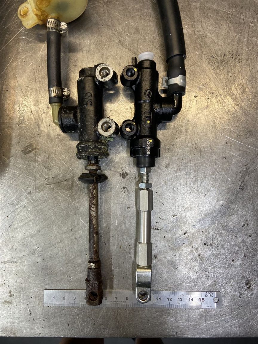 2つのマスターを比較します。プッシュロッドが60ミリほど短いので、70ミリの延長アダプターを製作します。