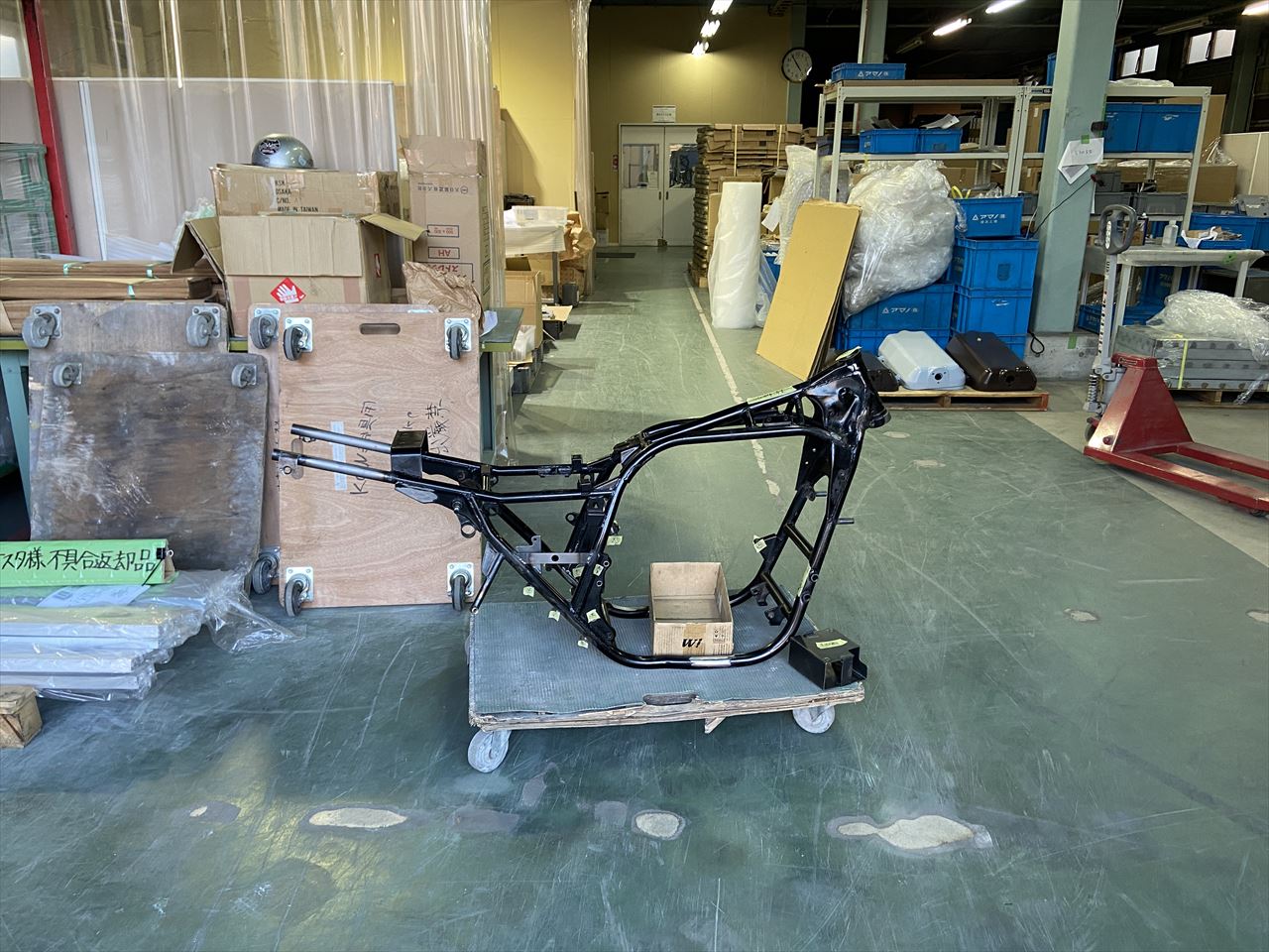 こちらでフレームとバッテリーケースをパウダーコートしていただきます。現在も大変業務量が多いそうで、納期は2ヵ月ほどとのこと。塗装が完成するまでは、エンジンの作業などを進めます。