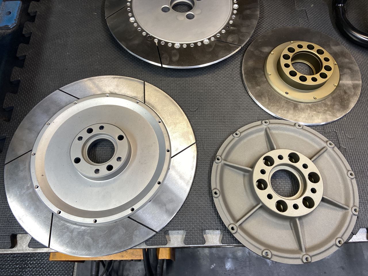 S1ローター化は急遽決まったもの。左側にある総削り出しのインナーローターを使います。鋳物で作った右側の現行品は、取り付け穴が4穴仕様の在庫が無く、新規製作には3~4ヵ月かかるので中古の在庫品で対応することになりました。こちらは10年以上前に製作したもので、S1ローター開発時に使用したもので、当初は6穴仕様だったものをあとから4穴仕様に改造していたので、今回ボルトオンで付くだろうという目論見です。