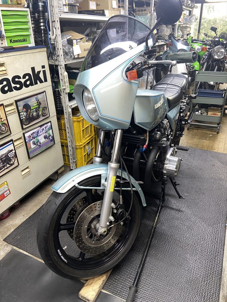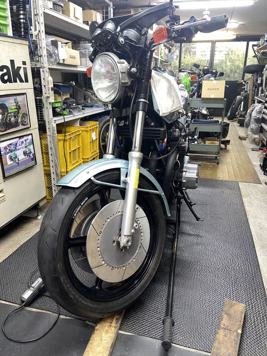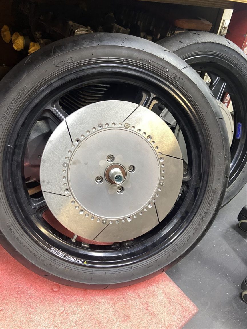 今回はブレーキローターとスイングアームなど足回り変更と、ハンドル変更によるポジション改善、および、スタックタコメーター取り付けなどのカスタムです。