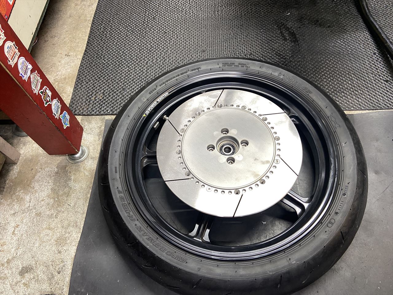 フロント周りを外します。現状はノーマルローターにAP2ポッドキャリパーの組み合わせです。ホイールはビトーのマグタンです。