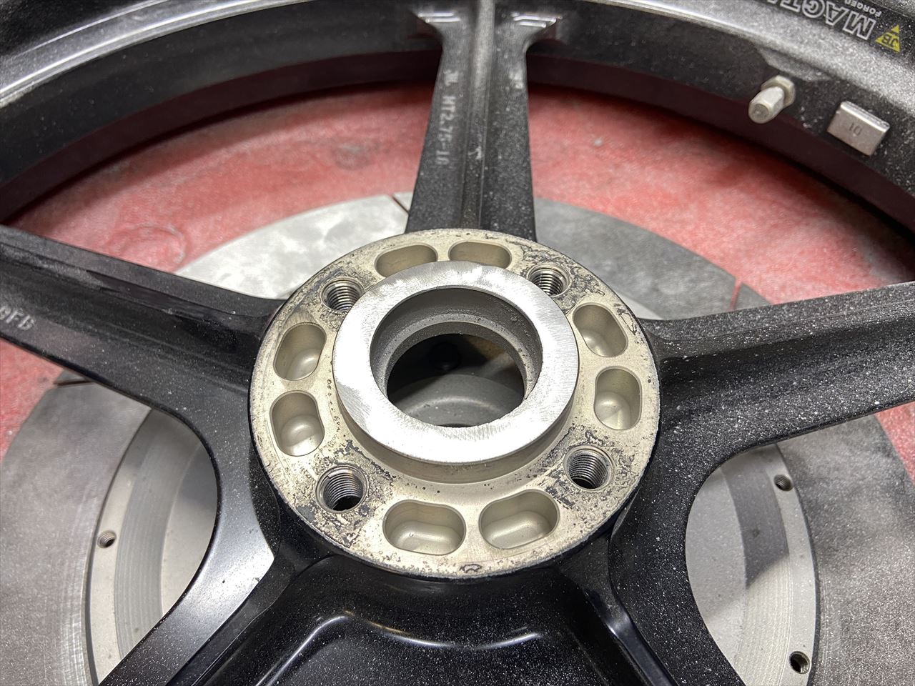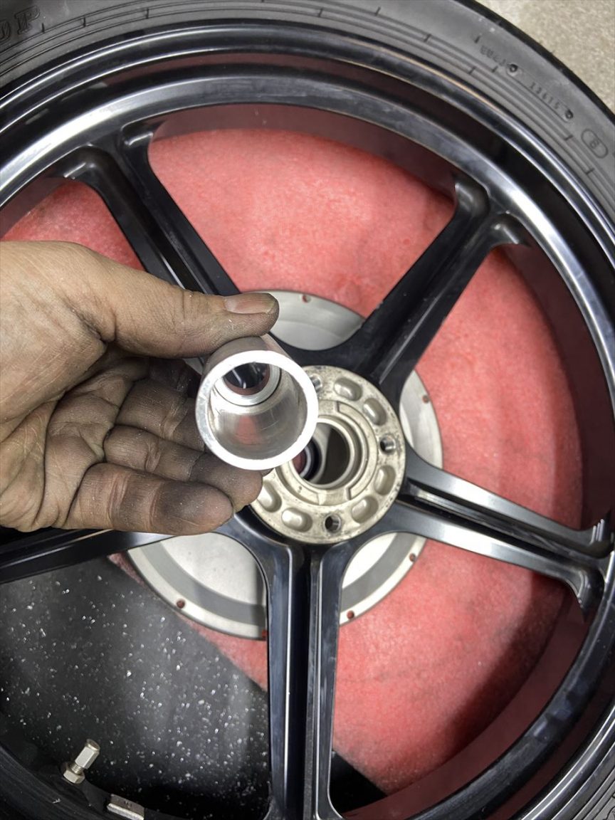 片側のローターを取り付け、ディスタンスカラーを製作して仕込みます。